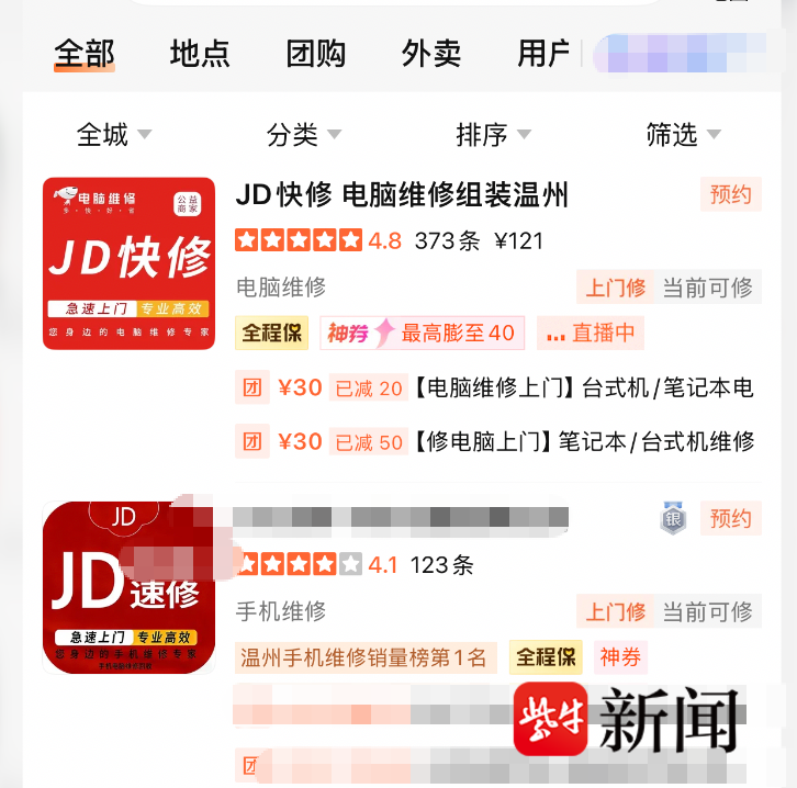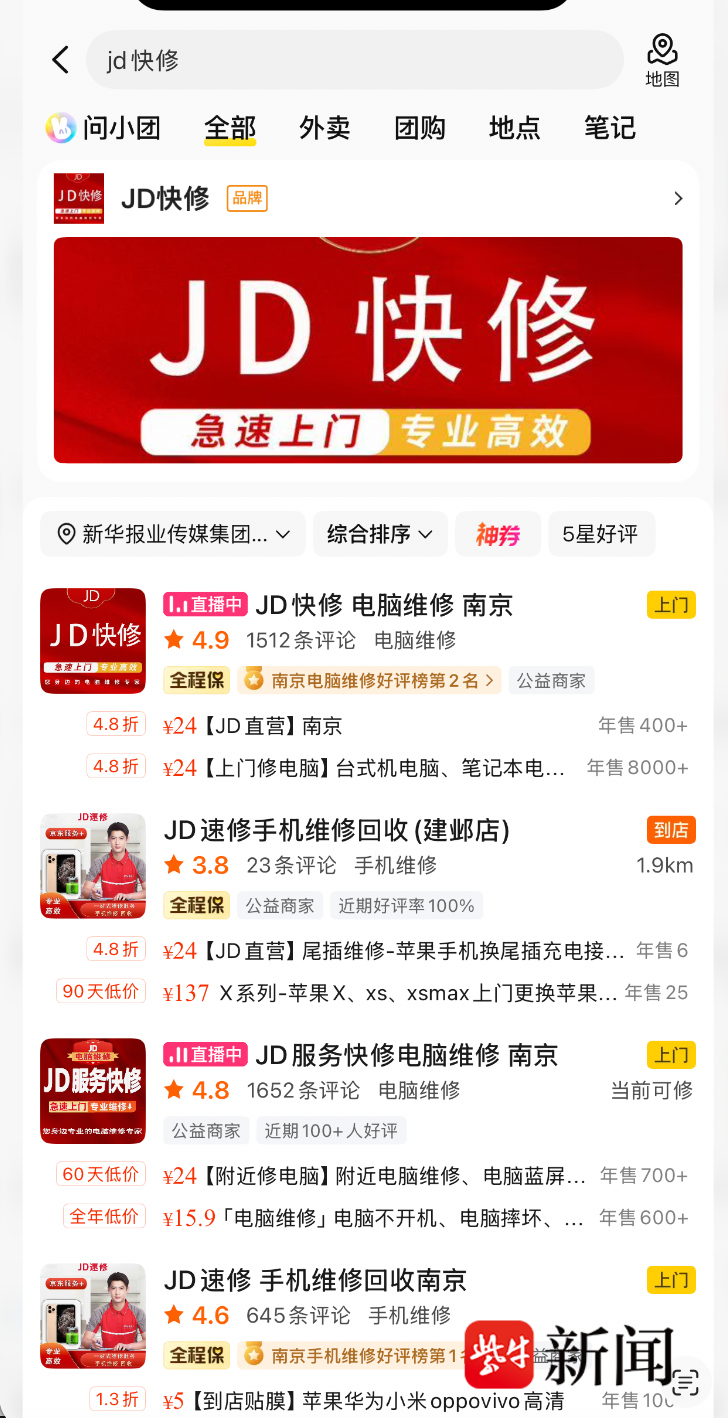 小王告诉扬子晚报/紫牛新闻记者,4月8日下午,她不慎将矿泉水洒在同学的联想笔记本电脑上,因缺乏维修经验且急于处理,她便在网络平台搜索电脑维修服务。当她看到一个名为“JD快修”店铺位列平台销量榜靠前位置,且该店铺名称和图标均与京东相似,便认为是正规维修机构,随即致电咨询。