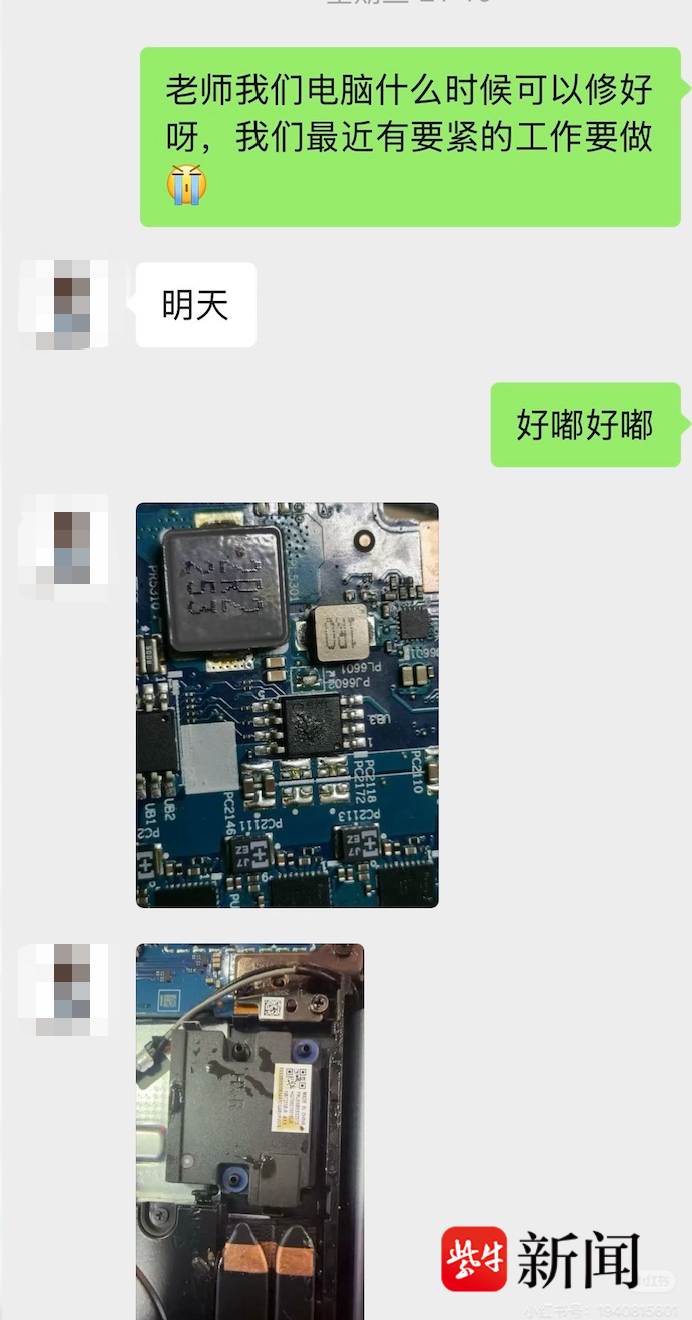 小王回忆,取走电脑后,当晚那名维修师傅给她发送多张电脑拆机照片,声称电脑内部腐蚀严重,需要进一步检测,随后告知小王,电脑的升压芯片、内存、声卡均存在问题,可能需要更换内存。4月9日,师傅又补充表示,电脑硬盘损坏需进行数据恢复,小王与同学因不懂电脑技术、担心设备损坏,便同意维修。