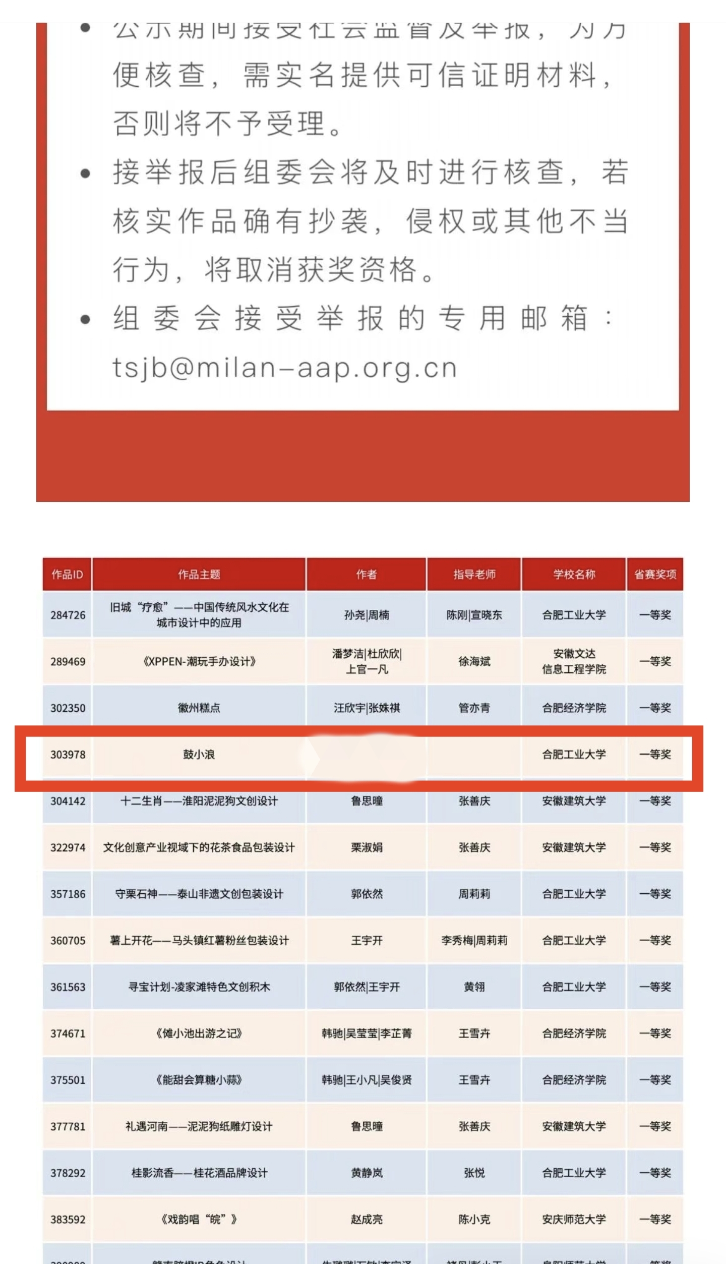 近日,福州大学厦门工艺美术学院的小李(化名)在社媒发帖称,自己在2021年完成的研究生动画毕设《鼓小浪》,被合肥工业大学的三名同学抄袭,“盗用者直接把片尾的作者、指导老师、学院等信息剪了拿去投比赛”,并在第九届“米兰设计周——中国高校设计学科师生优秀作品展”非命题赛场获得国赛一等奖,获奖结果已于2025年6月18日在“米兰设计周高校设计展”官网公示。
