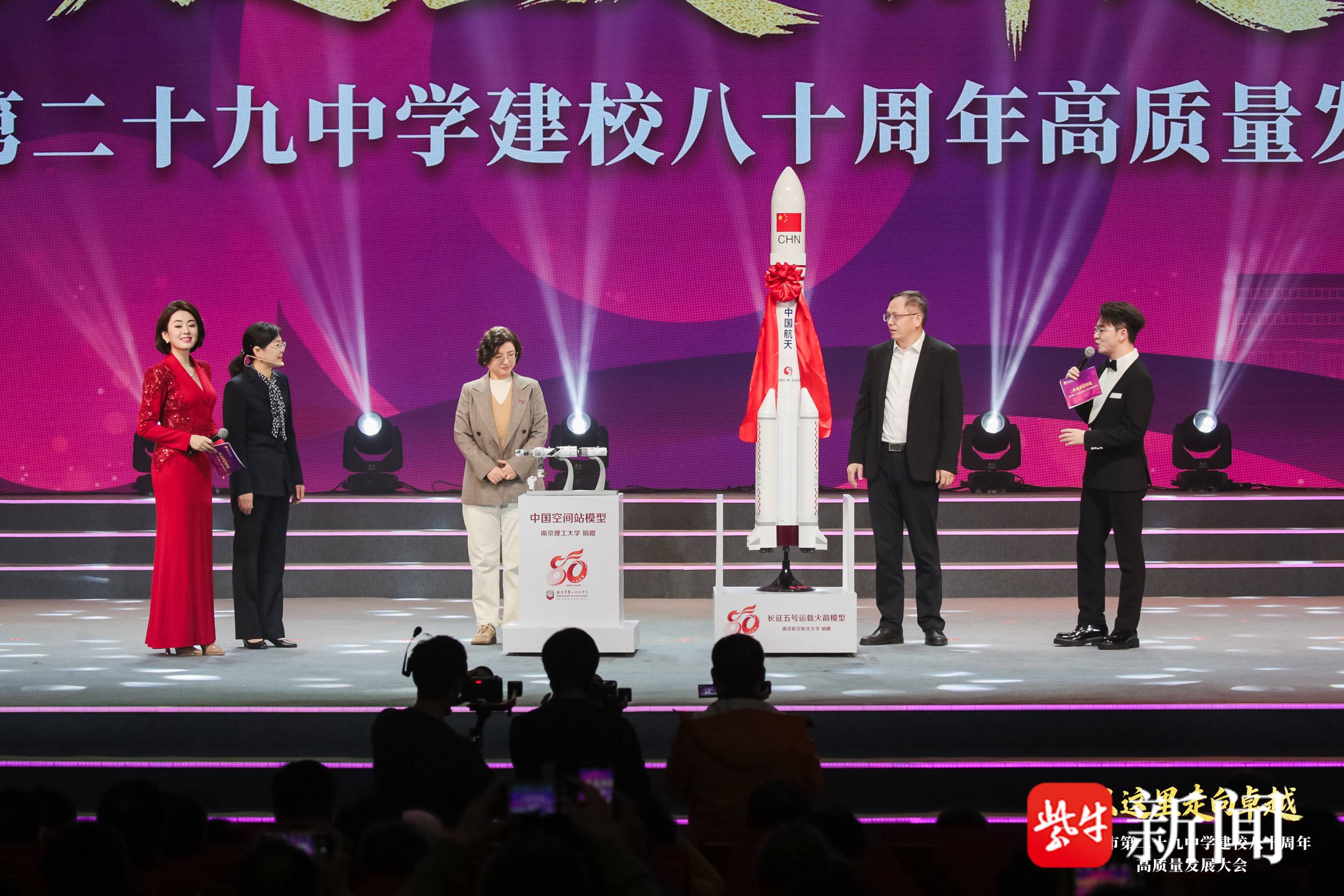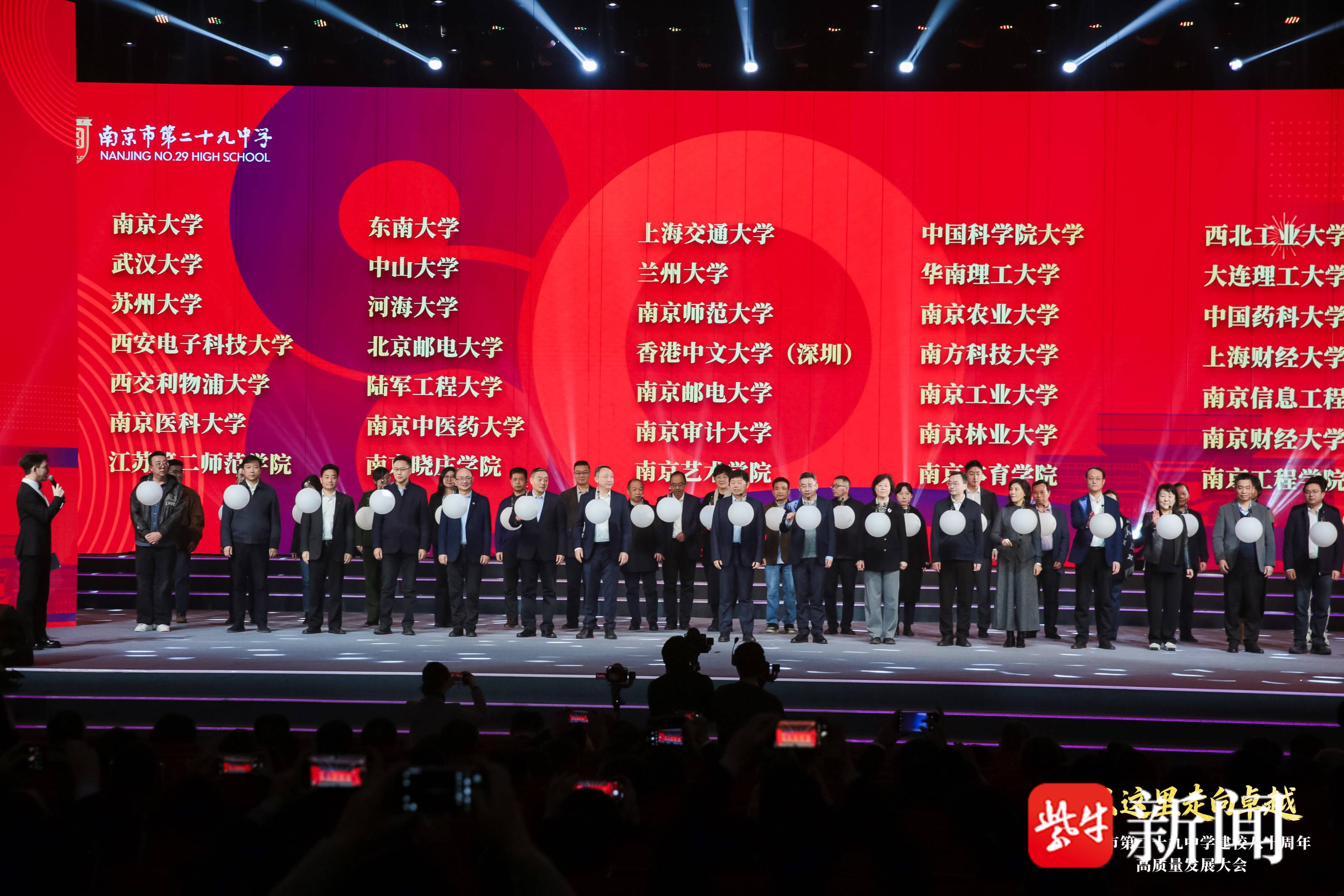 会上,南京大学、东南大学、上海交通大学、中国科学院大学等30余所高校代表登台,一同启动“从这里走向卓越”点亮仪式。南京大学副校长陆现彩介绍,“最近五年,二十九中有186位学生走进南京大学校园。当前南大和二十九中开展着‘国优计划’等深入合作,期待二十九中从今天开始走向更卓越。”东南大学副校长金石表示,“近三年,二十九中一直稳定在东南大学全国生源的前三名。目前东大与二十九中携手共创双高衔接,相信两校的合作未来大有可为。”此外,南京航空航天大学、南京理工大学还为二十九中学子赠送了长征五号火箭模型和中国空间站模型。