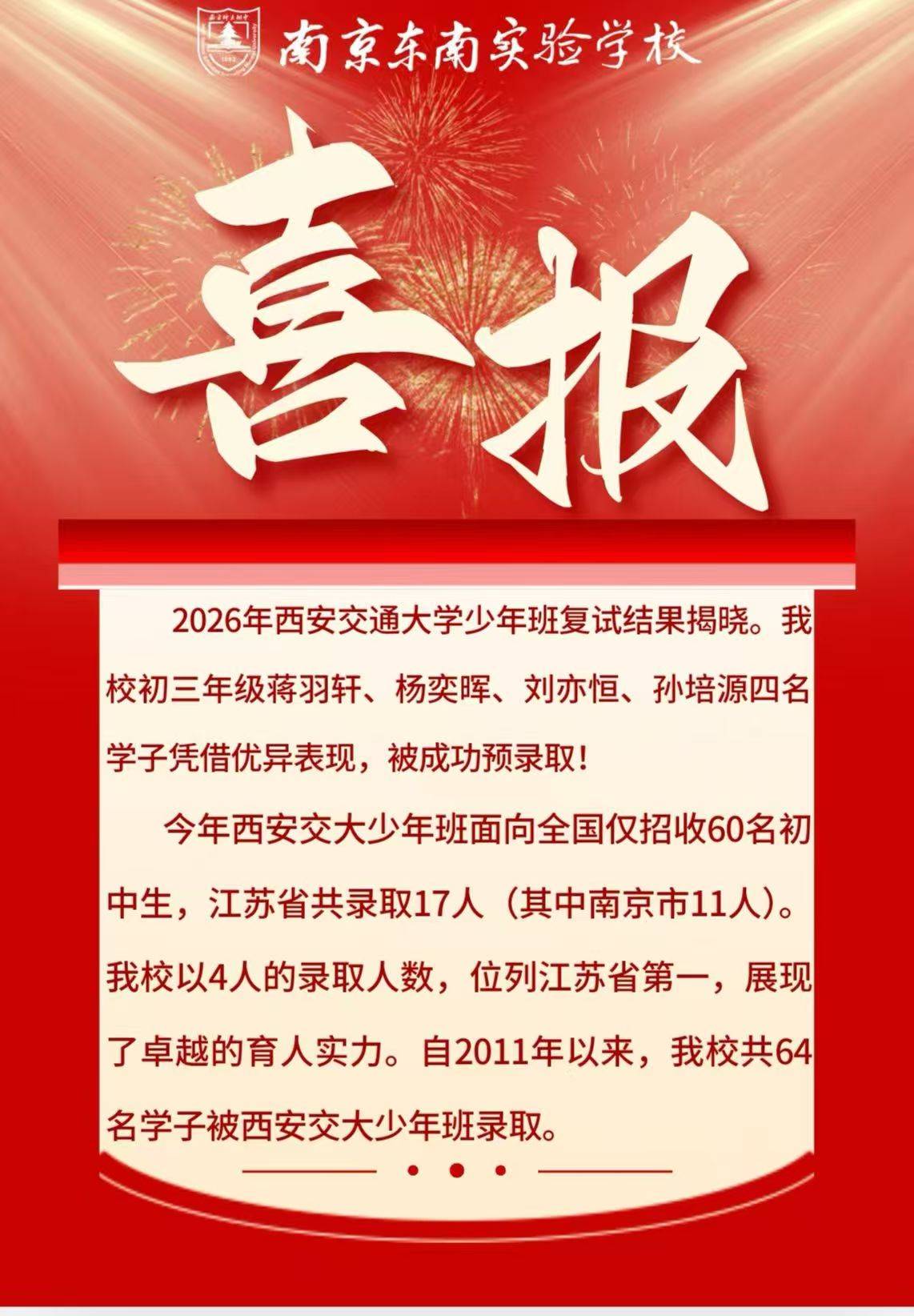 记者从南京东南实验学校了解到,2026年西安交通大学少年班复试结果揭晓。学校初三年级蒋羽轩、杨奕晖、刘亦恒、孙培源4名学子凭借优异表现,被成功预录取。