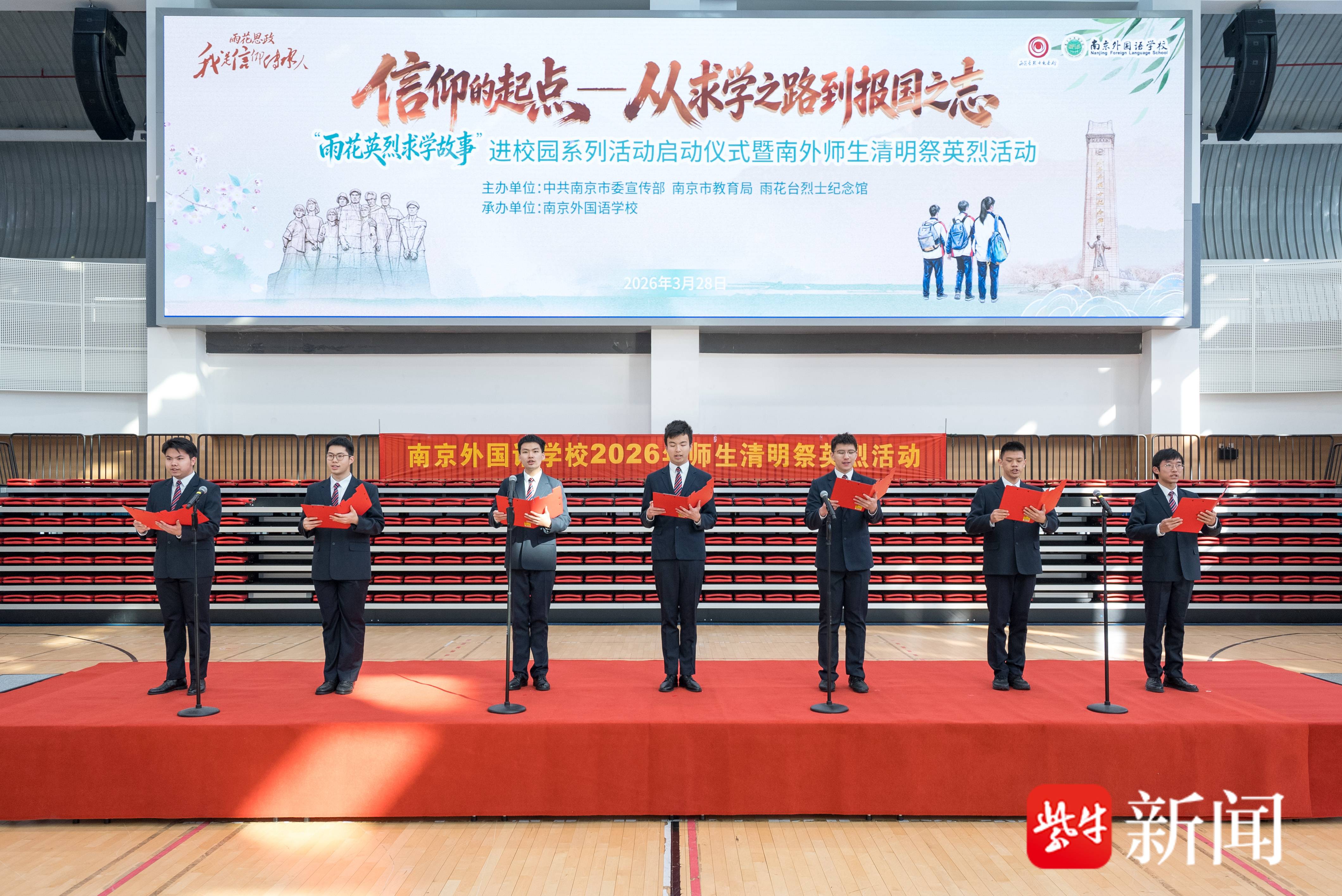 上午8时15分,“雨花英烈求学故事”进校园系列活动启动仪式暨南外师生清明祭英烈活动在南京外国语学校南部新城校区举行。本次活动由中共南京市委宣传部、南京市教育局、雨花台烈士纪念馆主办。