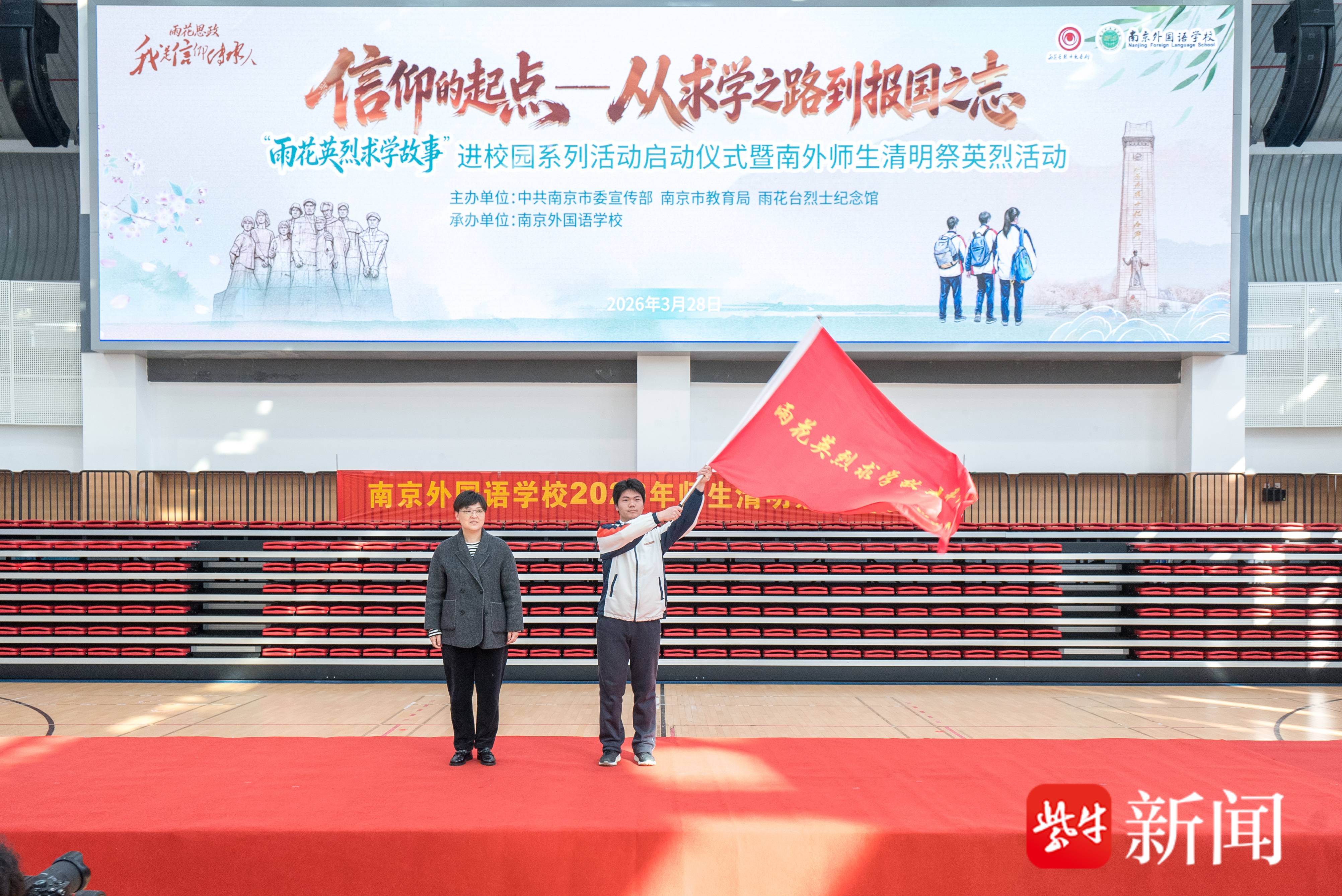 现场,南京市委宣传部一级调研员张发强、雨花台烈士陵园管理局副局长金陵、南京市教育局宣德处处长王京、南京外国语学校党委书记刘前树和学生代表一同启动“雨花英烈求学故事”进校园系列活动。雨花台烈士陵园管理局社会教育处副处长赵静为学生代表授予“雨花英烈求学故事寻访团”队伍旗帜。
