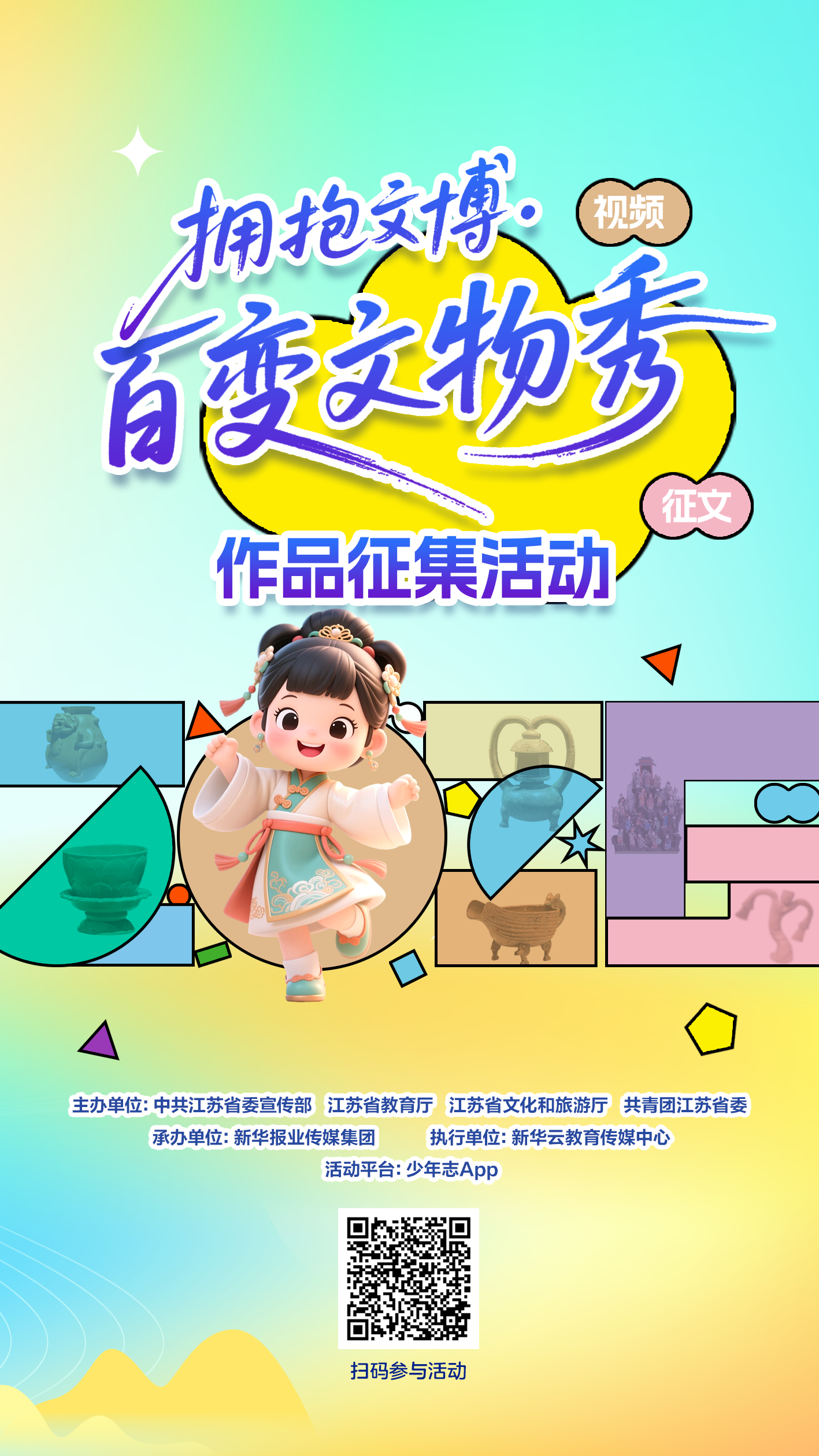 让江苏的宝藏文物“活”起来!为引导广大青少年走进文博场馆、增强文化自信、提升人文素养,由江苏省委宣传部、江苏省教育厅、江苏省文化和旅游厅、共青团江苏省委主办,新华报业传媒集团承办的2026“拥抱文博”江苏青少年文化实践行动特别推出“拥抱文博·百变文物秀”作品征集活动,来自南京、苏州、扬州等多个设区市的同学们纷纷投稿,用创意表达赋予文物鲜活生命力。