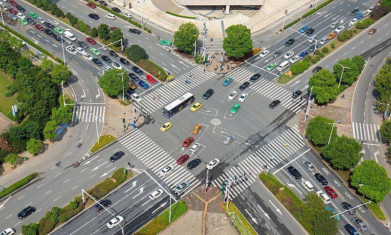 十字路口车流、人流量较大,应保持低速行驶,及时停车避让行人。