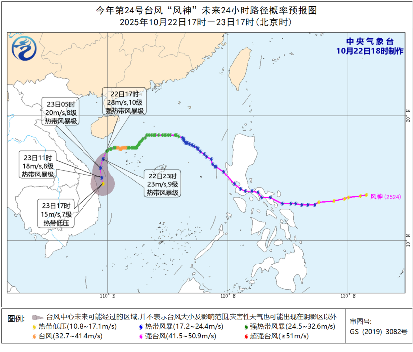 预计,“风神”将以每小时15公里左右的速度向南偏西方向移动,强度逐渐减弱(见图1)。中央气象台10月22日18时继续发布台风黄色预警。