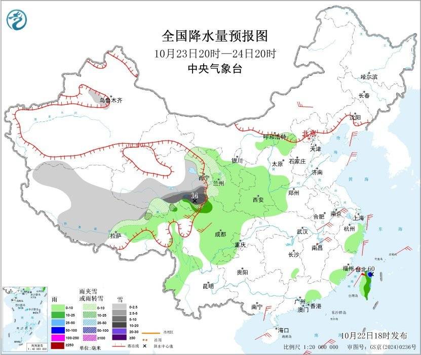 10月23日20时至24日20时,新疆沿天山地区、青海东部和南部、西藏中西部、甘肃中部等地部分地区有小到中雪或雨夹雪,其中,青海东南部等地部分地区有暴雪(10~14毫米);甘肃西南部、川西高原北部、台湾岛中东部等地部分地区有中到大雨,其中,台湾岛东北部等地部分地区有暴雨(50~60毫米)。山东半岛、安徽中部、江苏南部、江西北部、广西东南部、广东中部、海南岛东北部等地部分地区有4~6级风;东海大部、台湾海峡、台湾以东洋面、南海北部和中西部、北部湾将有7~8级、阵风9级的大风,其中台湾海峡的风力可达9级、阵风10~11级(见图4)。