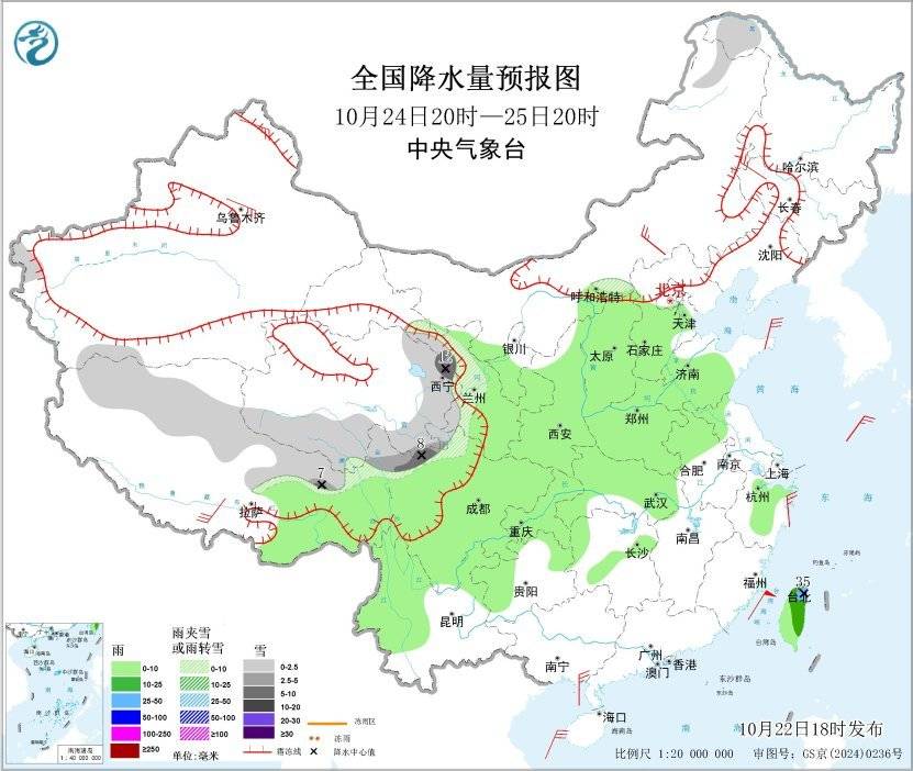 10月24日20时至25日20时,内蒙古东北部、黑龙江西北部、新疆西南部、西藏中北部、青海东部和南部、甘肃西部、川西高原北部等地部分地区有小到中雪或雨夹雪,其中,西藏东北部、川西高原北部等地部分地区有中到大雪,青海东北部等地局地暴雪(10~12毫米);台湾岛中东部等地部分地区有中到大雨(25~35毫米)。内蒙古中部、新疆西北部、西藏南部、山东半岛、浙江东部沿海、广西南部等地部分地区有4~6级风;台湾海峡、南海北部、北部湾有6~8级风(见图5)。