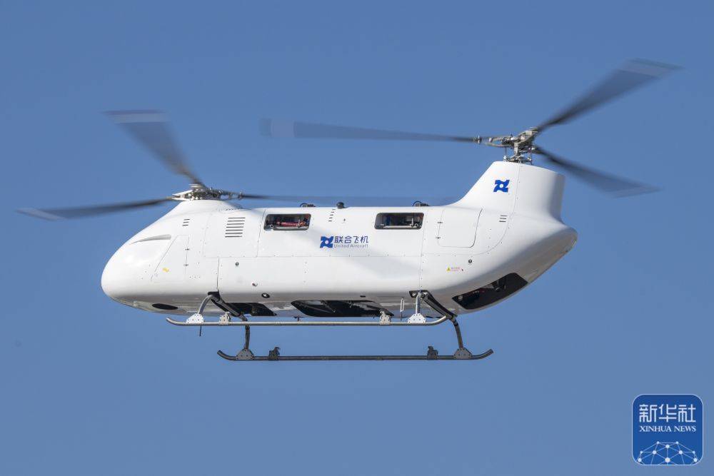↑10月30日,在哈尔滨市平房区的哈尔滨联合飞机科技有限公司,T1400无人直升机在飞行中。新华社发 (刘洋 摄)