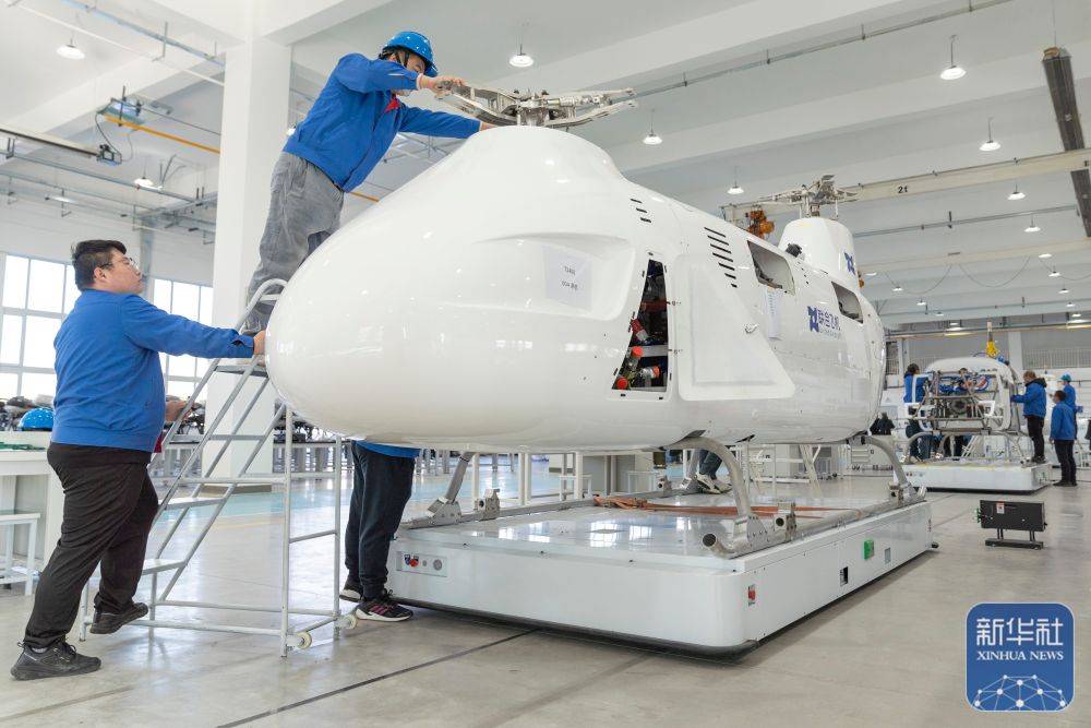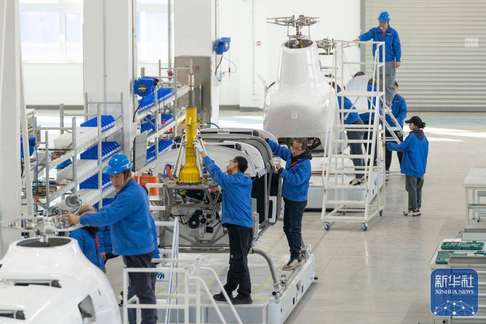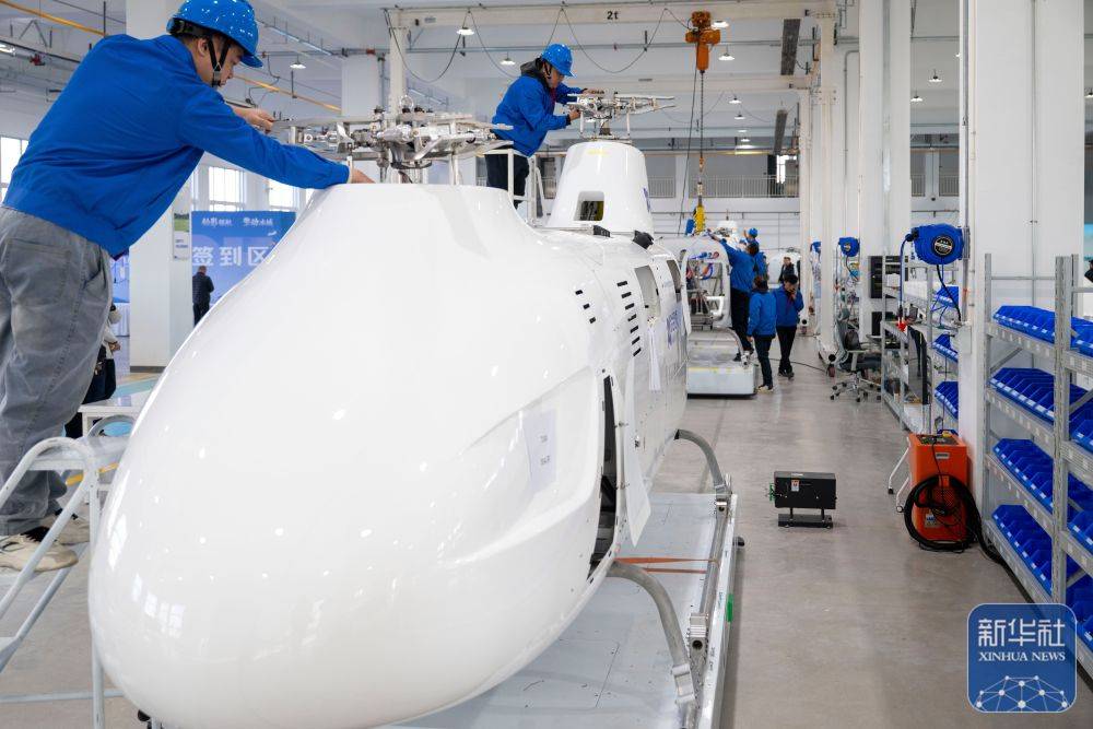 ↑10月30日,在哈尔滨市平房区的哈尔滨联合飞机科技有限公司生产厂区,工作人员装配T1400无人直升机。新华社记者 张涛 摄
