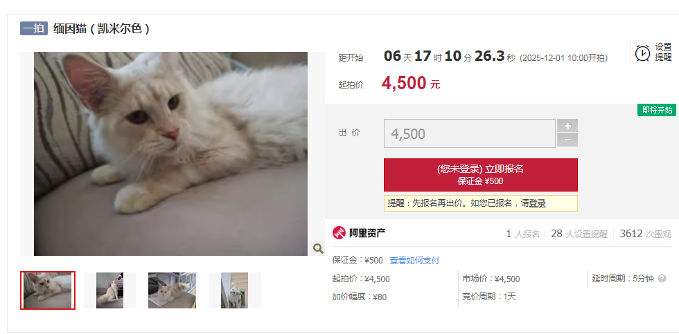 又有宠物猫上了拍卖平台,这一次是缅因,起拍价4500元 详情