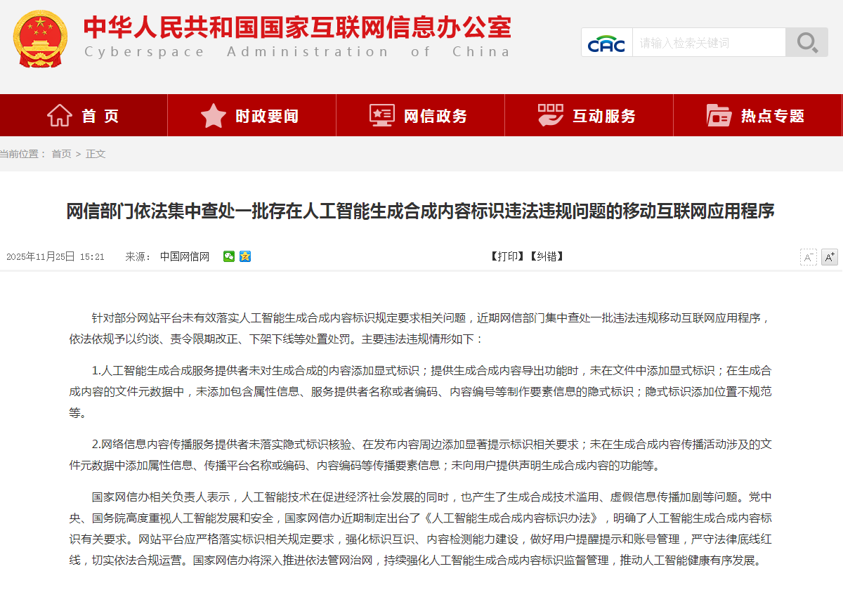 涉及AI生成合成内容标识违法违规问题 一批移动互联网应用程序被查 详情