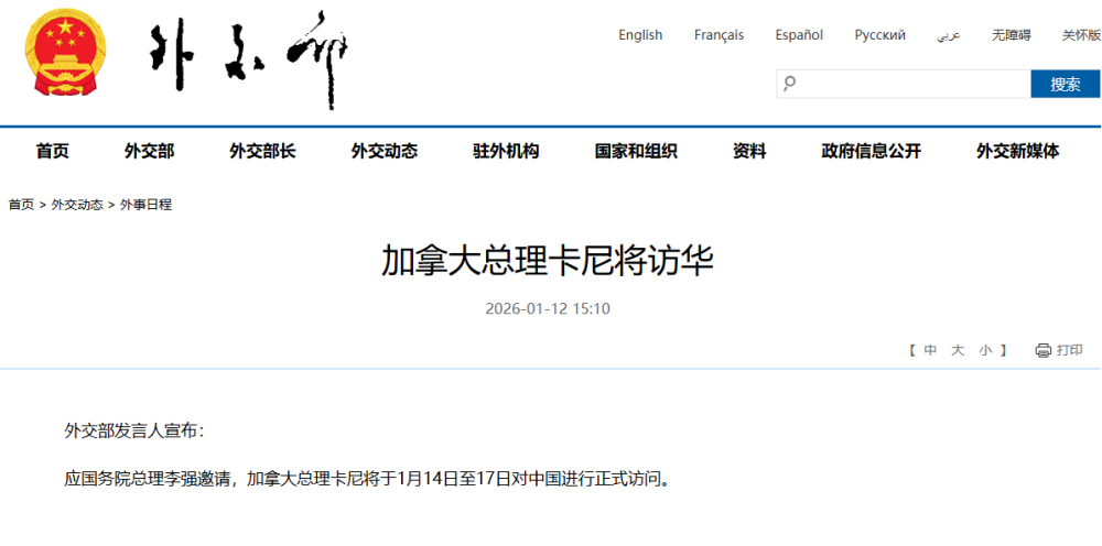 应国务院总理李强邀请,加拿大总理卡尼将于1月14日至17日对中国进行正式访问。