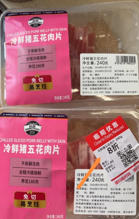 记者在随帖配发的图片中看到,发货方是奥乐齐无锡滨湖万达店,两份“冷鲜猪五花肉片”有一份是正常的产品,另一份则贴有“临期优惠8折”的纸条,保质期到2026年1月14日。对此,有网友觉得“太离谱”,还有网友则表示,应该是拣货的没注意,可以直接和客服联系。