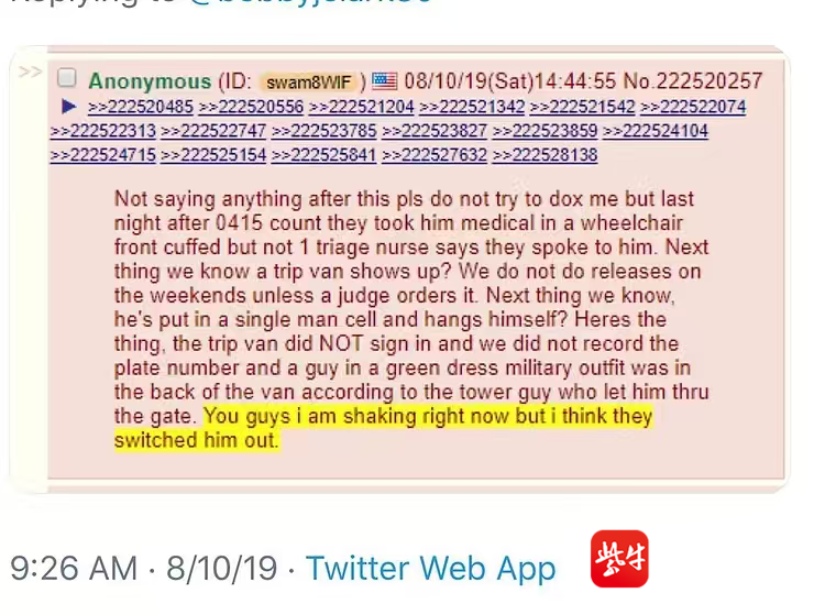 2019年8月10日,爱泼斯坦在狱中死亡。当天早上,有人在网上匿名发帖,声称自己此前一天目睹爱泼斯坦被锁在医疗轮椅上离开了牢房,与此同时,一辆未经许可的车辆抵达监狱。这个帖子暗示官方发布爱泼斯坦自杀的公告前,已经将爱泼斯坦“调包”。