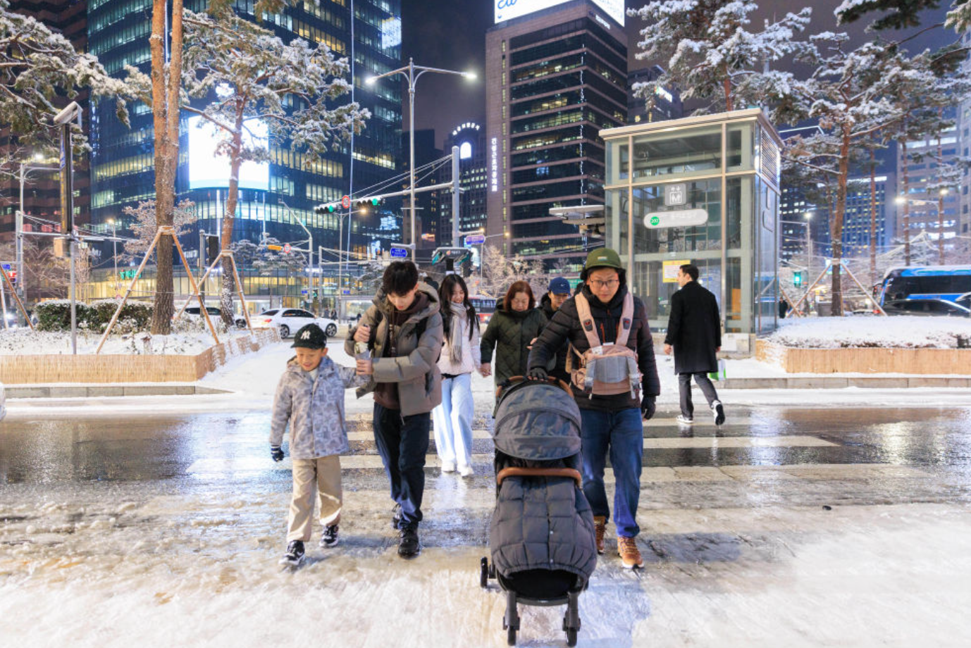 2025年12月4日,在韩国首尔,人们在雪中出行。新华社发(朴晋泽摄)