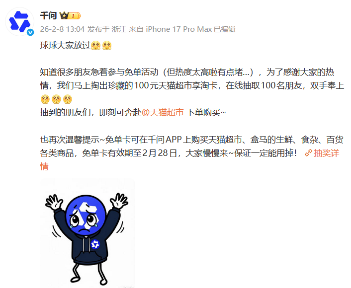 下午,千问发文称“球球大家放过”,知道很多朋友急着参与免单活动,但热度太高有点堵。千问再次提醒免单卡有效期至2月28日,大家慢慢来,保证一定能用掉!