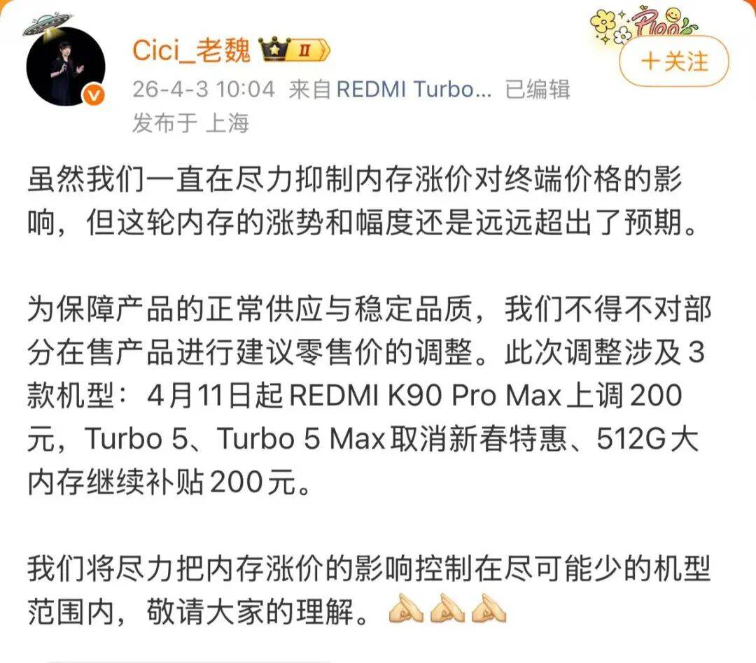 为保障产品的正常供应与稳定品质,我们不得不对部分在售产品进行建议零售价的调整。此次调整涉及3款机型:4月11日起REDMI K90 Pro Max上调200元,Turbo 5、Turbo 5 Max取消新春特惠、512G大内存继续补贴200元。