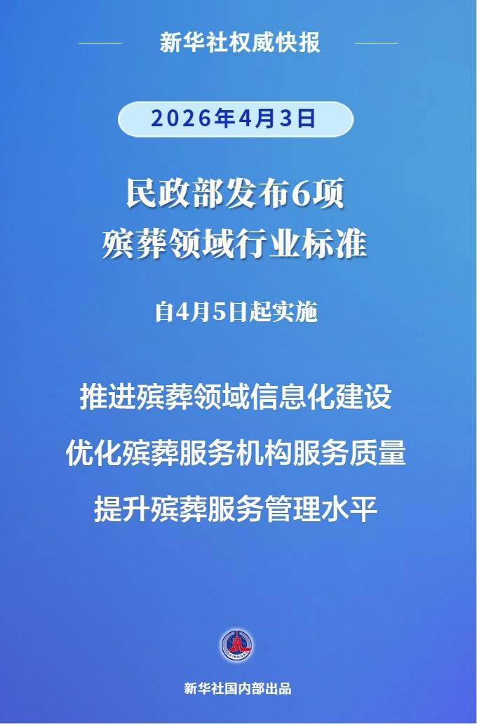 民政部4月3日发布《殡葬管理服务信息系统数据共享和交换规范》《殡葬服务公众满意度测评》等6项新制定、修订的殡葬领域行业标准,对推进殡葬领域信息化建设、优化殡葬服务机构服务质量等作出规定,着力提升殡葬服务管理水平,夯实“逝有所安”制度保障。系列标准自今年4月5日起实施。