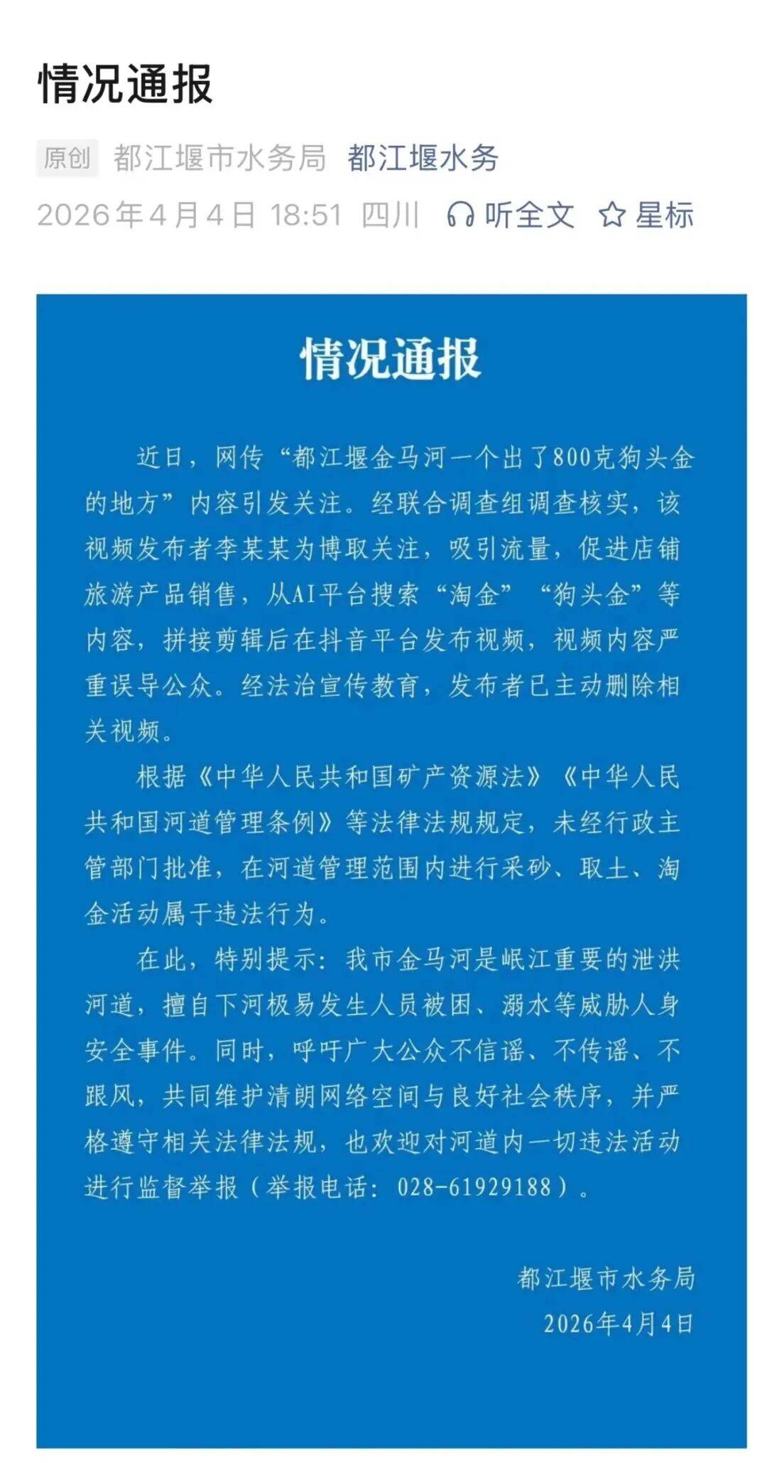 对此,4月4日都江堰市水务局发布情况通报称,经联合调查组核实,相关视频系李某某为博取关注,吸引流量,促进店铺旅游产品销售,从AI平台搜索“淘金”“狗头金”等内容,拼接剪辑在网络平台发布,视频内容严重误导公众。经法治宣传教育,视频发布者已主动删除相关视频。