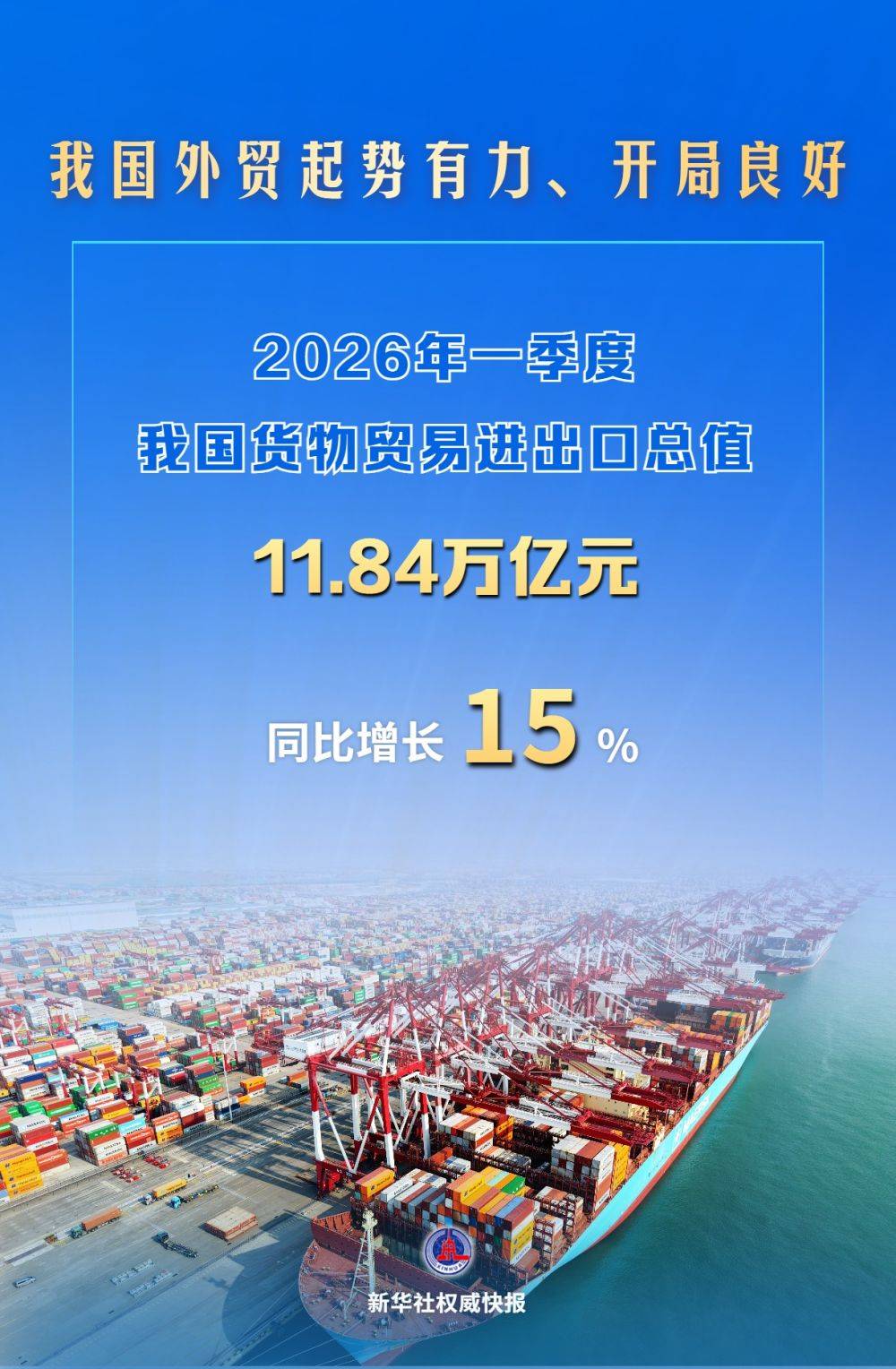 海关总署4月14日发布数据显示,2026年一季度我国货物贸易进出口总值11.84万亿元,历史同期首次超过11万亿元,同比增速保持两位数增长,达到15%。