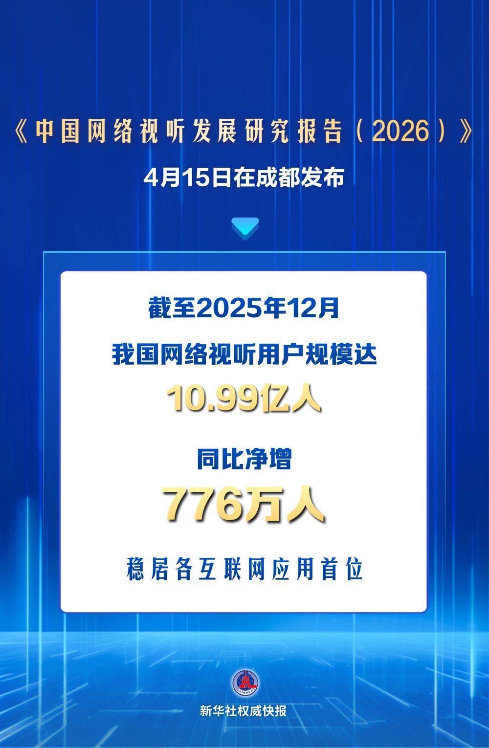 报告显示,截至2025年12月,我国网络视听用户规模达10.99亿人,同比净增776万人。