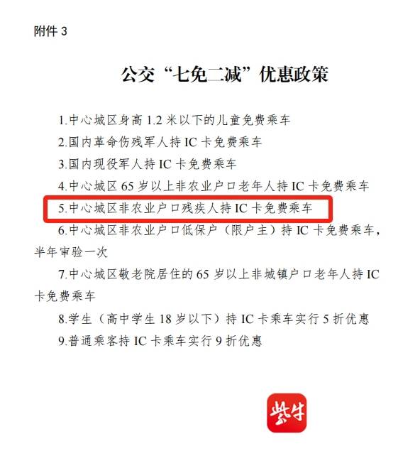 扬子晚报/紫牛新闻记者查询发现,2024年,内江市有关部门发布的《内江市中心城区城市公共交通运营补贴管理办法》提到,公交针对部分人群实行“七免二减”优惠政策,其中明确“中心城区非农业户口残疾人持IC卡免费乘车”。