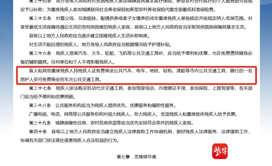 同时,记者注意到,据《中华人民共和国残疾人保障法》第五十条规定,县级以上人民政府对残疾人搭乘公共交通工具,应当根据实际情况给予便利和优惠;盲人持有效证件免费乘坐市内公共汽车、电车、地铁、渡船等公共交通工具。