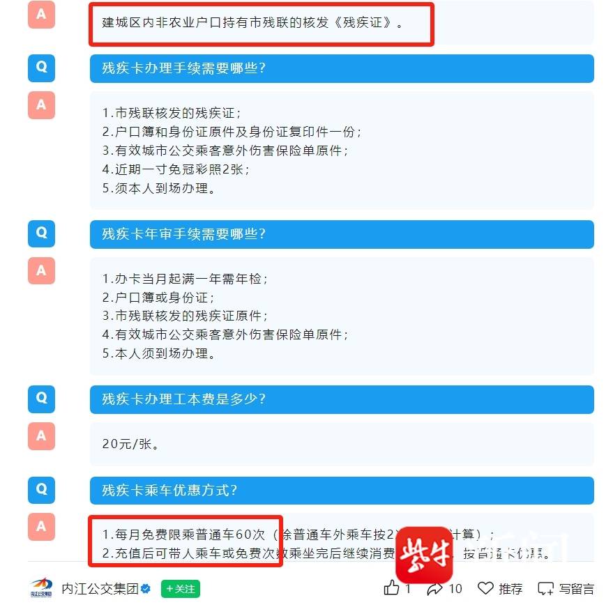 另据“内江公交集团”公众号,“爱心卡(残疾卡)”办理对象限定为建成区内非农业户口人员,且需持有市残联核发的《残疾证》。每月可免费乘坐普通公交60次,充值后可带人乘车,免费次数用完后可充值,按普通卡标准享受优惠。