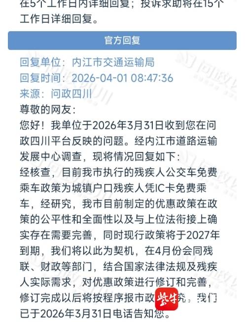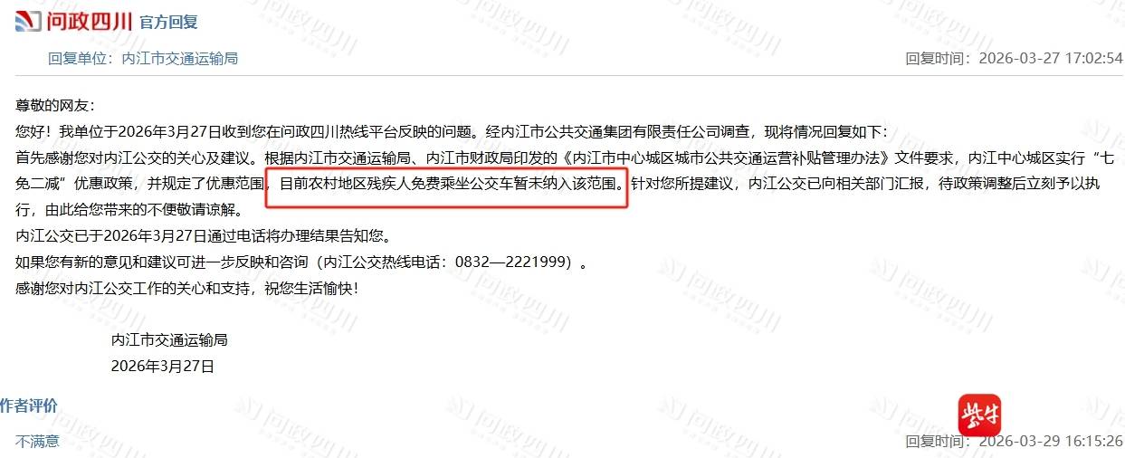 在吉先生提供的一份“问政四川”平台回复中,记者看到,2026年3月27日,内江市交通运输局曾向其进行答复称,目前内江中心城区免费乘坐公交的政策,确实未将农村地区残疾人纳入优惠范围。“针对您所提建议,内江公交已向相关部门汇报,待政策调整后立刻予以执行。”