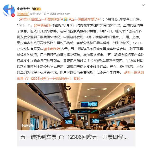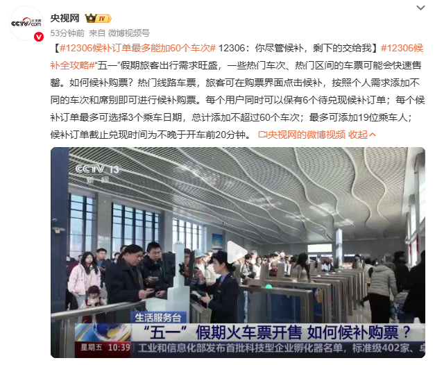 “五一车票开卖即候补”!12306候补订单最多能加60个车次,12306回应:你尽管候补,剩下的交给我