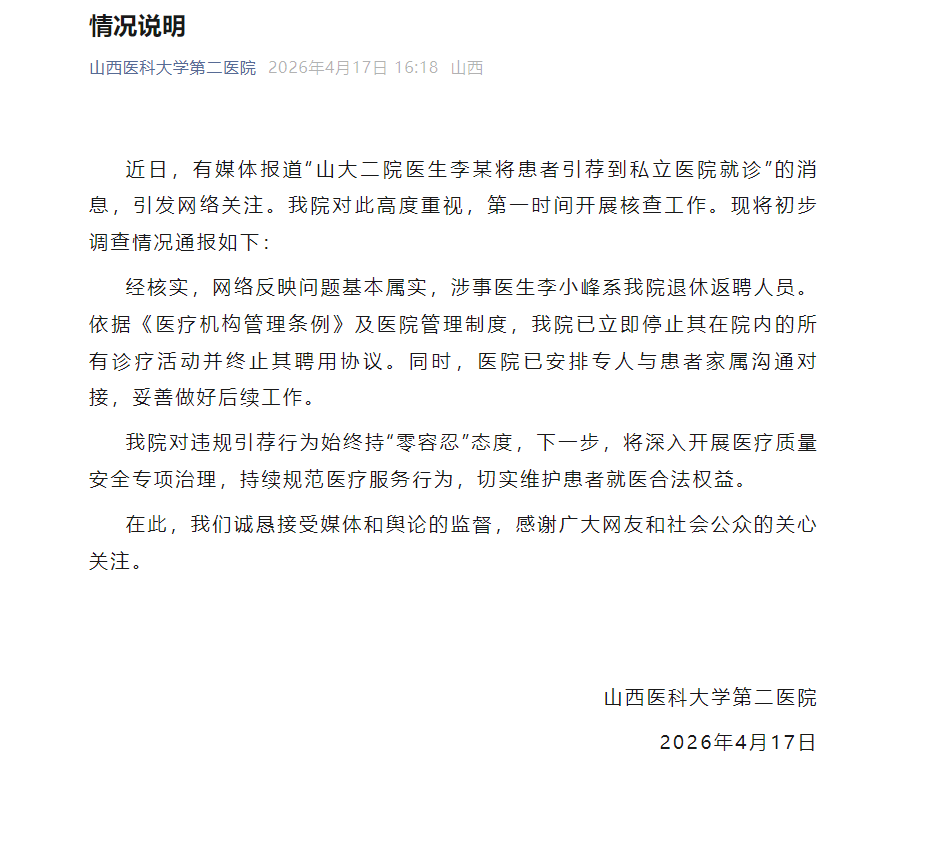 山西医科大学第二医院回应“医生李某将患者引荐到私立医院就诊”:基本属实,已终止其聘用协议