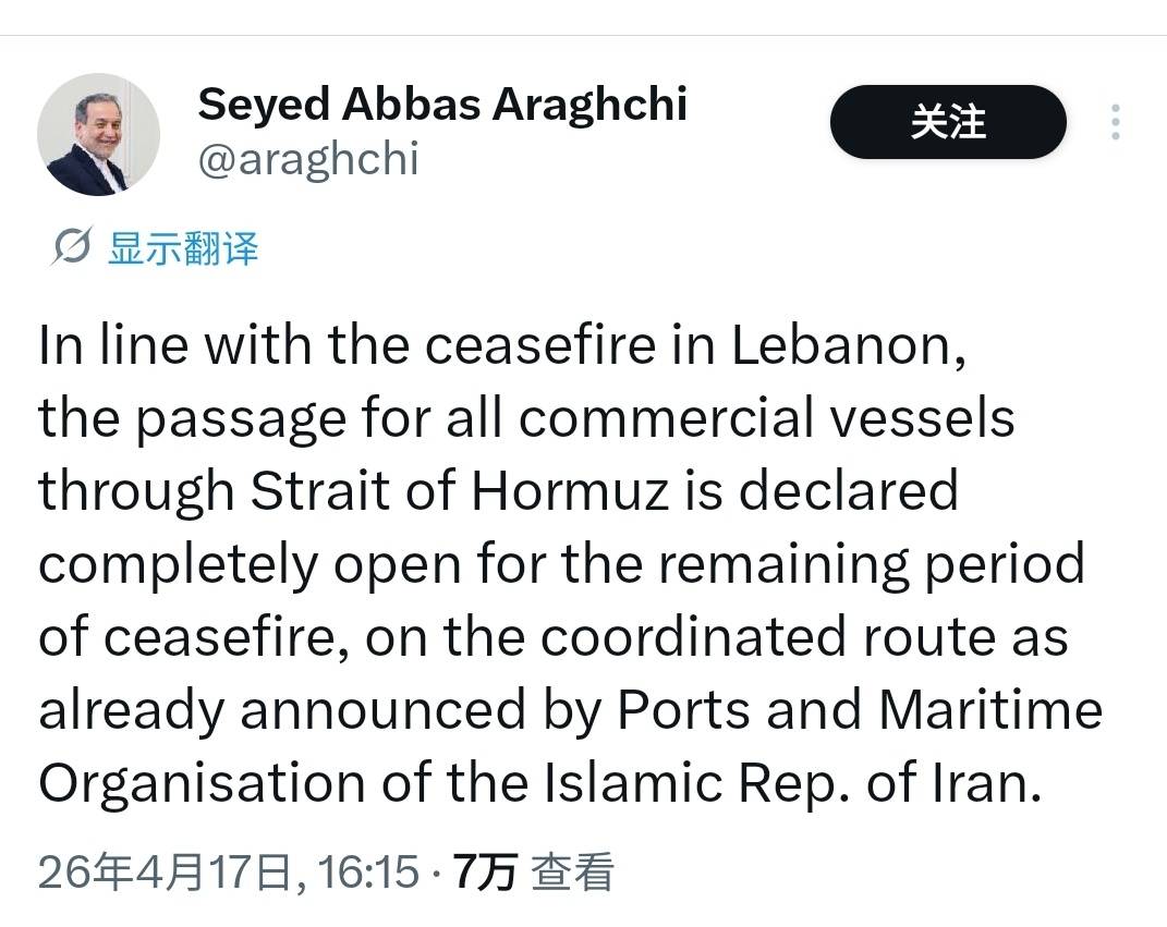 伊朗外长阿拉格齐17日说,鉴于黎巴嫩和以色列达成停火,在停火期间,伊朗对所有商船开放霍尔木兹海峡。美国总统特朗普随后予以确认。