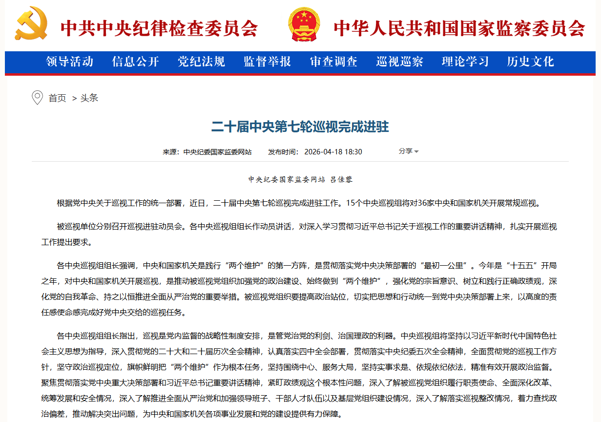 二十届中央第七轮巡视进驻完成 联系方式一览 详情