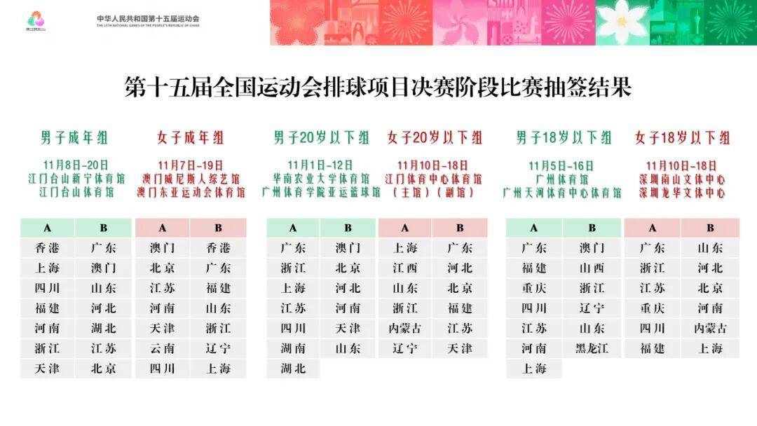第十五届全运会女排成年组比赛将于11月7日至19日在中国澳门举行,小组赛采用单循环赛制,各小组前四名晋级八强。