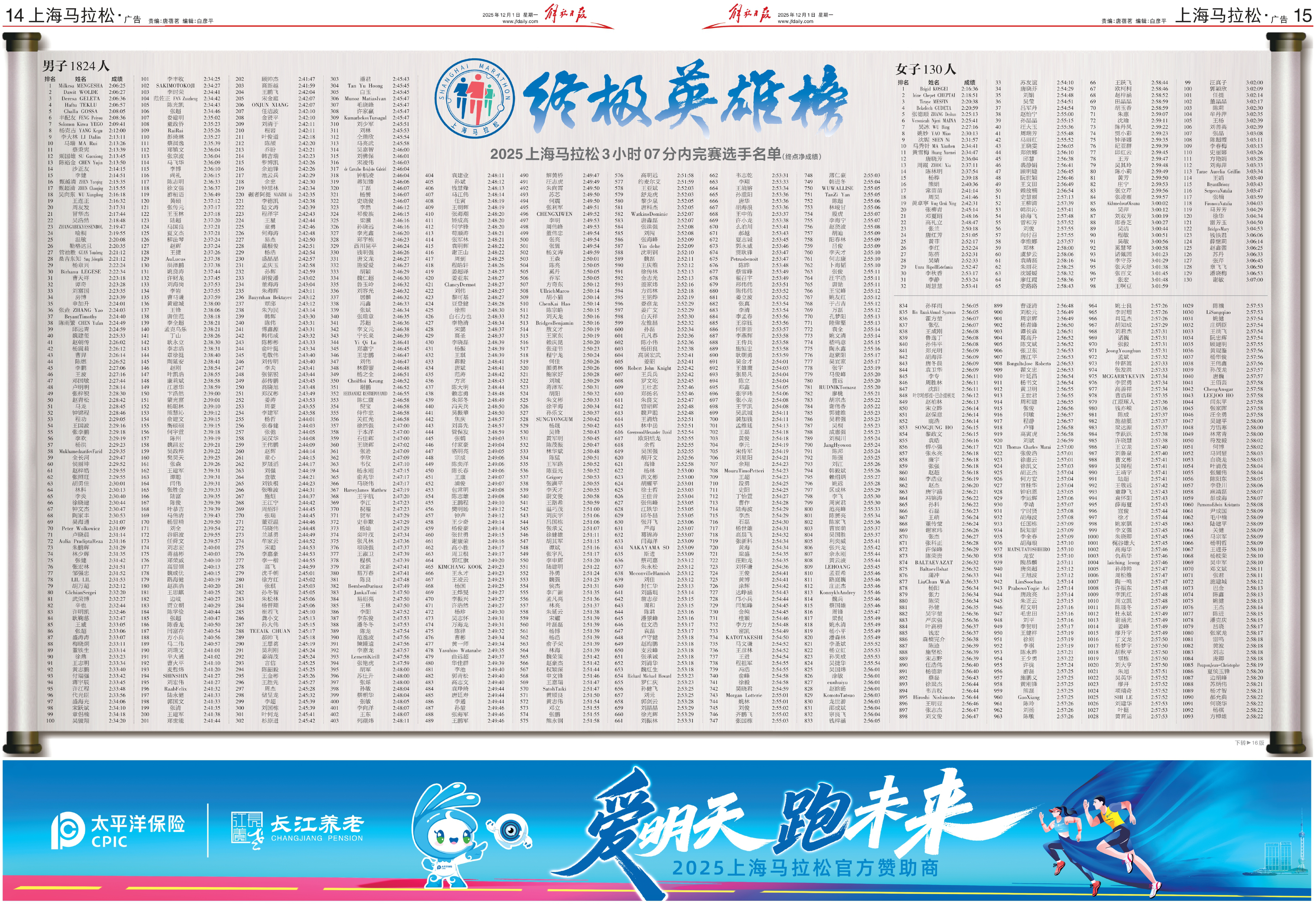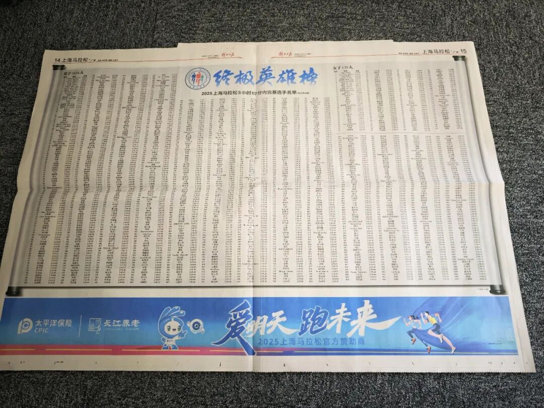 2025年上海马拉松刊登的完赛名单的报纸。来源于网络