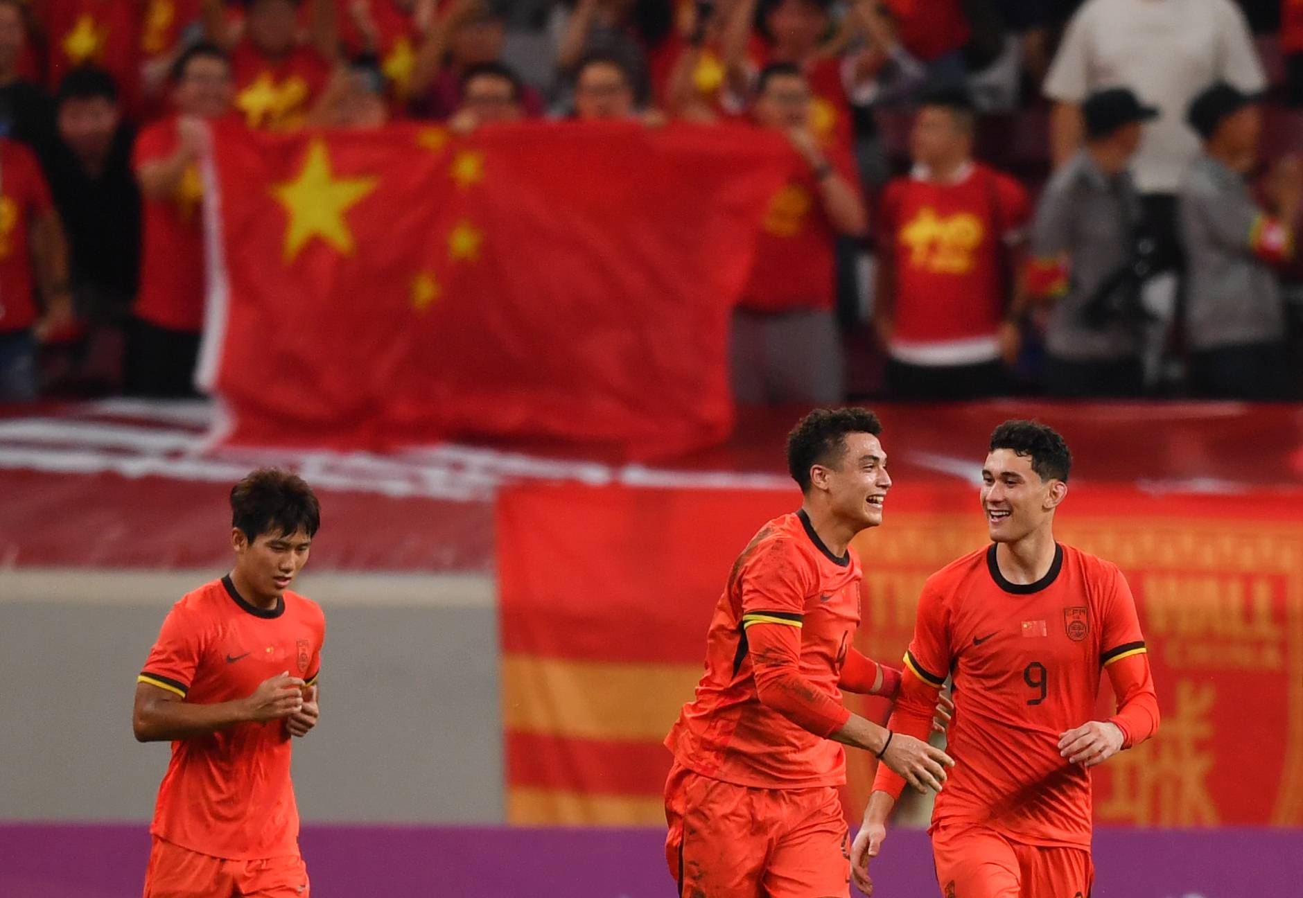 中国队球员拜合拉木·阿卜杜外力(右)在进球后与队友庆祝。