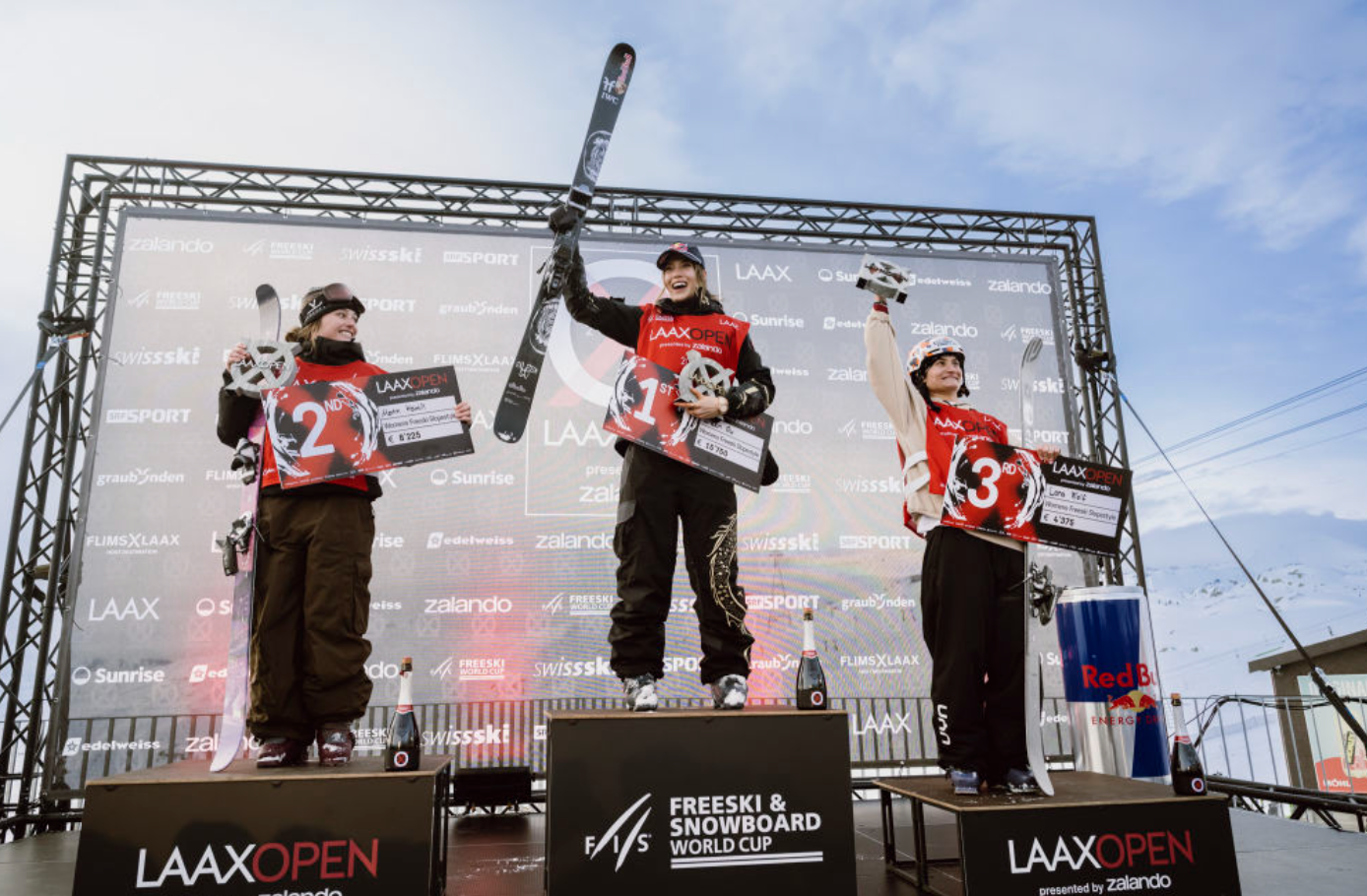 2026年1月17日,在瑞士莱克斯举行的国际雪联世界杯系列赛中获得女子自由式滑雪坡面障碍技巧冠军的谷爱凌(中)在领奖台上。新华社发(马塞尔·莱默希特 摄)