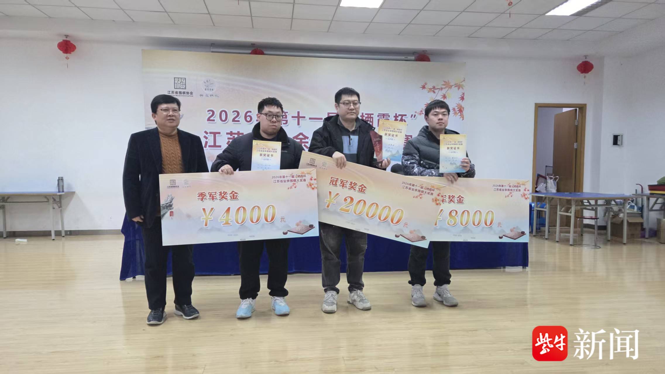 3月1至3日,2026年“栖霞杯”江苏省业余围棋大奖赛在南京市栖霞区全民健身中心隆重举行。经过8轮角逐,孟繁雄7段荣获公开组冠军,蔡润东7段和庞子钰5段分获亚军、季军。50岁以上常青树组由严剑刚6段折桂,张伟东6段荣获第二名,韩斌6段第三名。