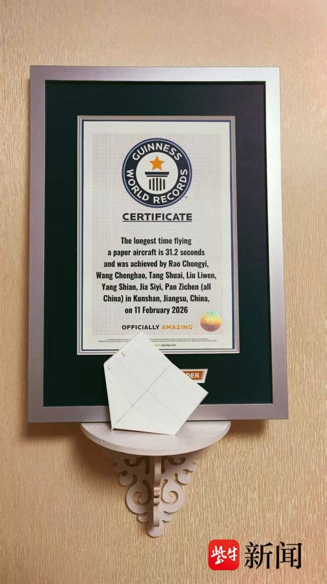 扬子晚报网3月25日讯(记者 姜天圣)近日,吉尼斯世界纪录官方正式确认:2026 年 2 月 11 日,在江苏昆山体育中心体育馆,由饶翀逸、王承昊、唐帅、刘力文、杨仕安、贾思熠、潘秭辰组成的中国青年团队,以31.2 秒的成绩成功刷新 “纸飞机飞行时间最长” 吉尼斯世界纪录,将日本选手户田拓夫 2010 年创造的 29.2 秒纪录提升 2 秒,打破该项纪录长达 15 年的垄断。值得一提的是,该团队中有 4 人此前刚刷新 “纸飞机飞行最远距离” 世界纪录,实现距离与滞空两项极限挑战的双重突破。