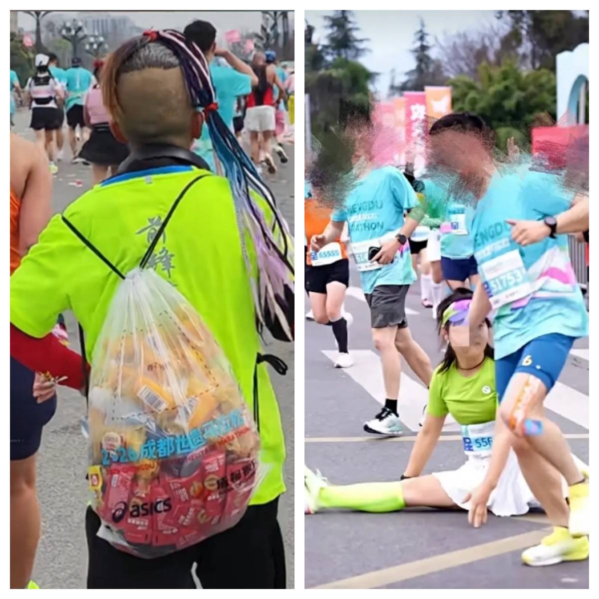 成都世遗马拉松赛道上的“打包哥”和“劈叉姐”。图片来自网络