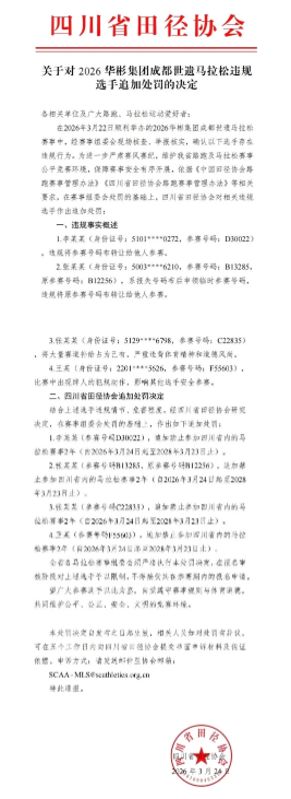 同日,四川省田径协会在组委会处罚的基础上,发布追加处罚通报。结合两名选手违规情节的严重程度及造成的不良影响,协会决定追加处罚:禁止张某某、王某两人参加四川省内所有马拉松赛事两年,禁赛期自2026年3月24日起至2028年3月23日止,进一步强化了对违规行为的惩戒力度。