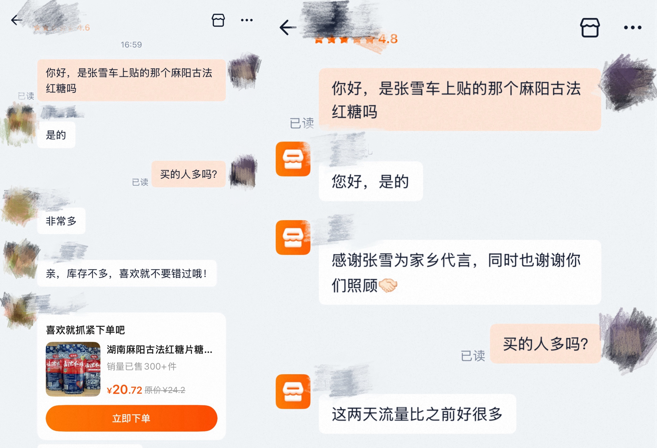 记者随机采访了如今两家销量火爆的店铺,店主均对张雪的家乡情怀表达了由衷感谢。“真的特别感谢张雪,他在国外比赛还想着老家的红糖,帮我们做了最好的宣传!”一位店主告诉记者,自从赛事夺冠后,店铺咨询量和订单量暴增。另一位店主也坦言,此前店铺销量平平,如今流量比之前好了很多,“感谢张雪为家乡代言,也感谢每一位购买的顾客的照顾。”