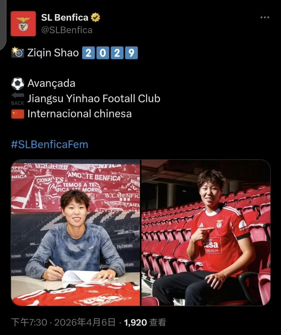 北京时间4月6日,葡萄牙本菲卡女足正式官宣,中国女足国脚、江苏籍中锋邵子钦成功加盟球队,双方签约至2029年。这位23岁的女足锋线新星,将在2026-2027赛季登陆葡萄牙女子全国联赛,携手葡超女足豪强向女足欧冠赛场发起冲击。此次留洋,既是邵子钦职业生涯迎来的重磅跨越,更是她冲刺顶级中锋行列、向着世界足坛至高荣誉迈进的关键一步。