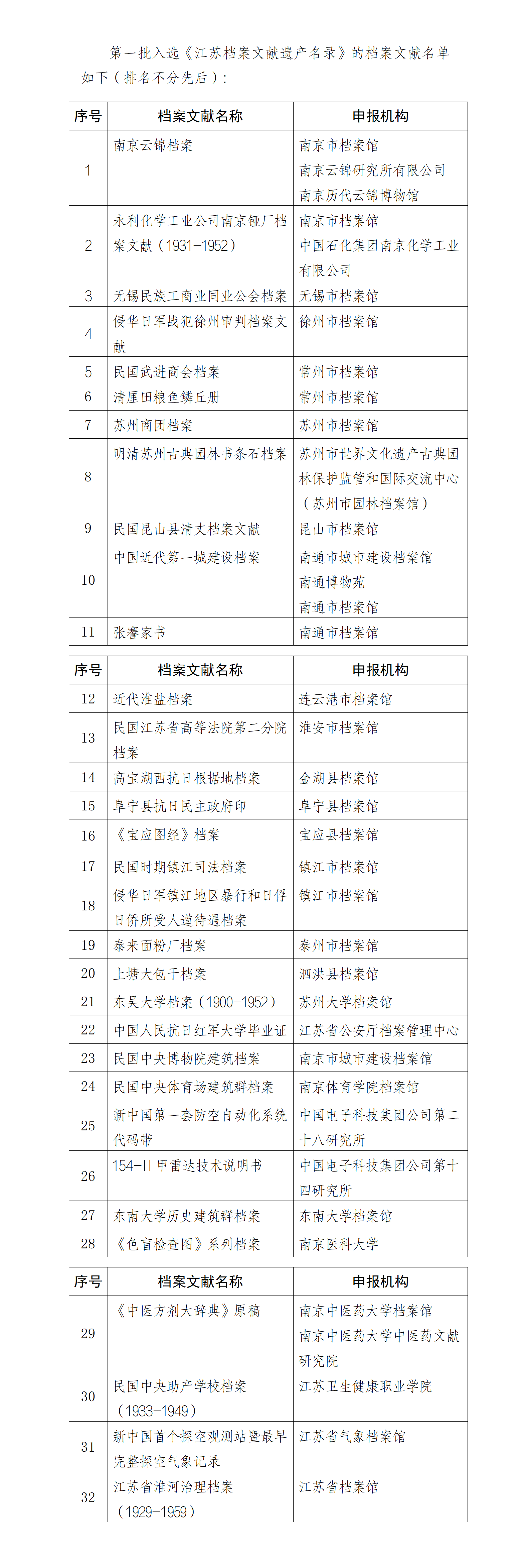 第一批《江苏档案文献遗产名录》完整名单见附表