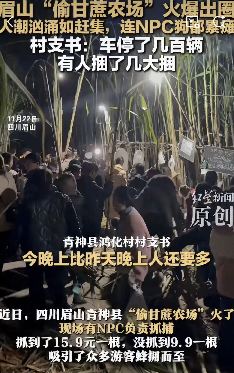 然而,狂欢背后的乱象也立刻暴露:甘蔗地被大规模破坏,遍地都是只啃了几口或拦腰折断的甘蔗;有游客崴脚或擦伤;通信基站超载导致手机信号中断,逃单现象频发;周边道路拥堵需要交警介入疏导……童鹏飞不得不在视频中恳求游客遵守规则、珍惜劳动成果。更值得注意的是,随着“偷甘蔗”模式走红,成都周边地区以及其他省份也已快速涌现出类似项目。