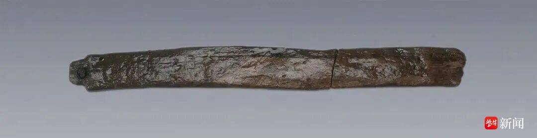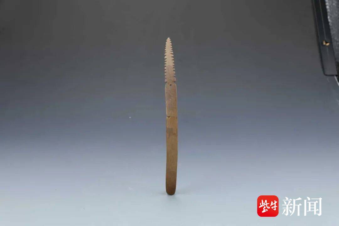 骨匕,用动物骨骼制成,通体磨制光滑。长近30厘米。前端为锯齿状,有数道细密的划痕,疑似缠绕编织物留下的痕迹。