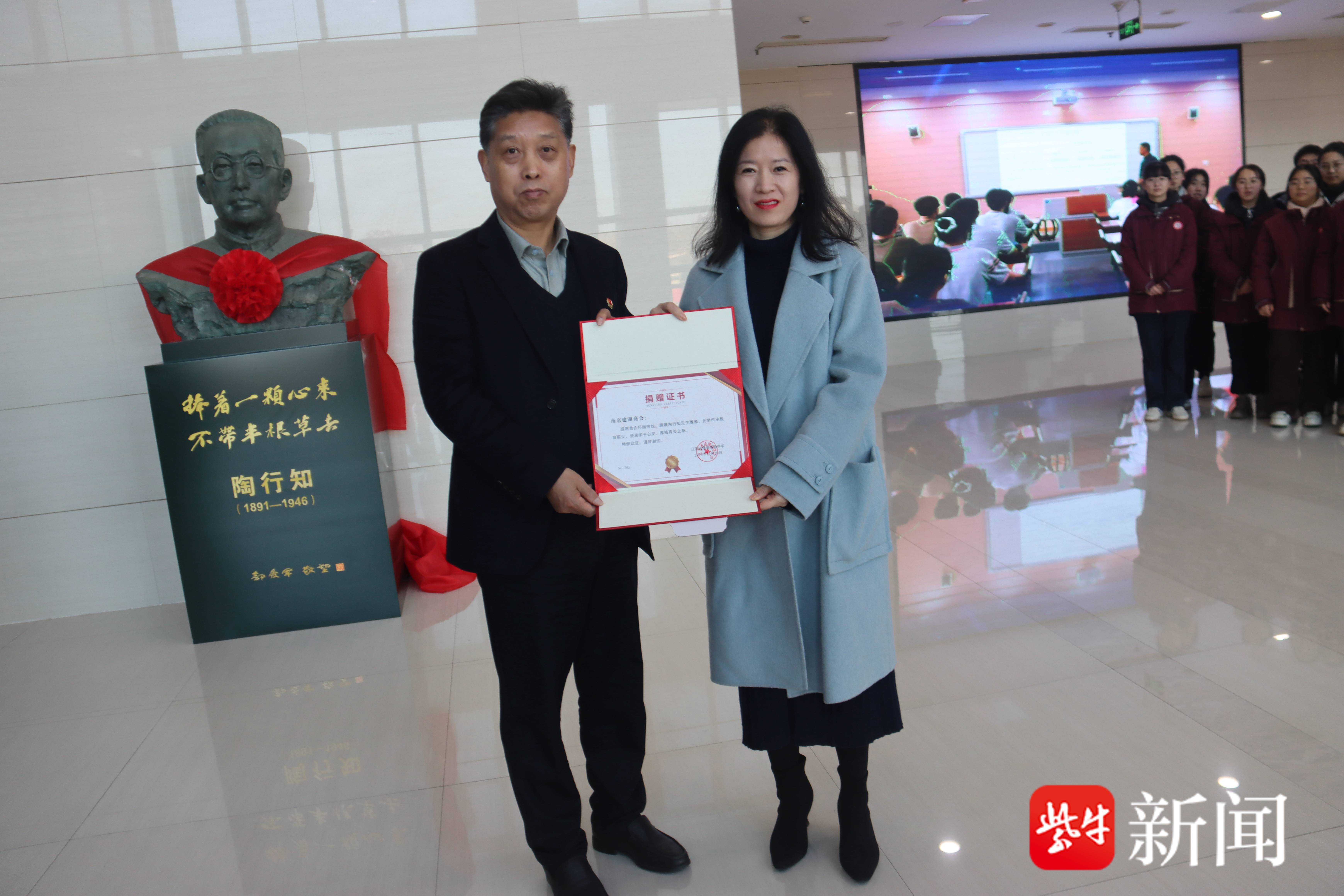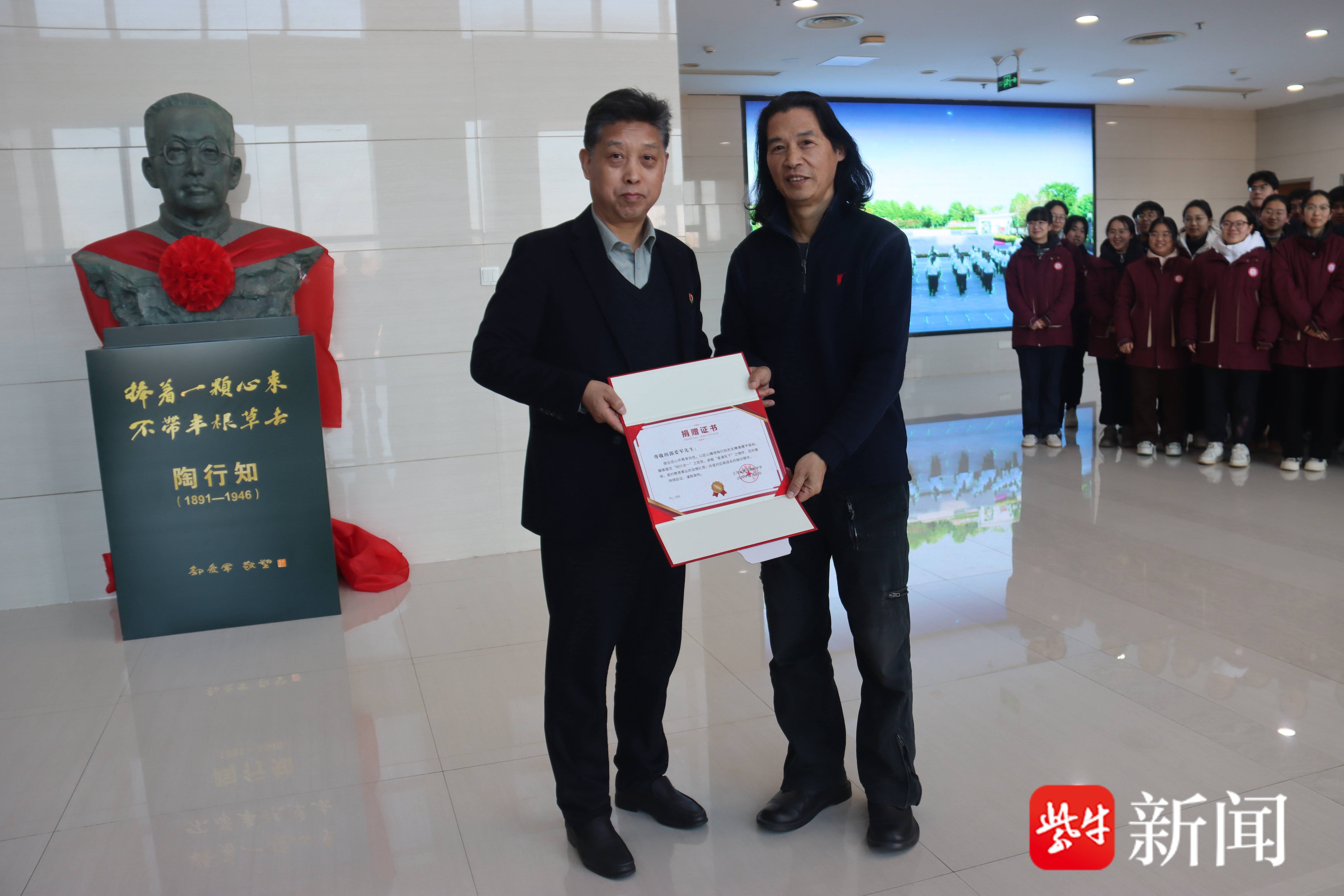 扬子晚报讯(记者 冯秋红)在金桂飘香的秋日,江苏省建湖高级中学迎来了建校一百周年。值此庆典之际,一座由雕塑家、南京雕塑协会会长东郭教授精心创作的陶行知先生铜像,于今日在校园内庄严落成。这座总高2.05米的青铜雕像,由南京建湖商会捐资兴建,不仅铭刻了乡贤反哺桑梓的深情,更成为传承“行知”精神、激励学子奋进的校园文化地标。