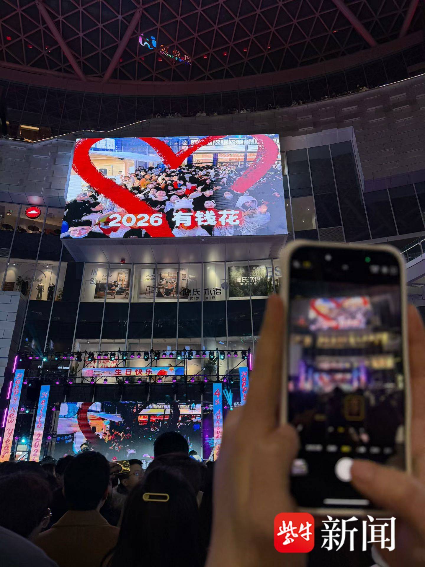 活动现场,主办方还贴心设置了照片直播二维码,让观众随时定格精彩瞬间、收藏美好回忆。跨年倒计时环节,全场观众手持荧光棒共同倒数,绚烂的礼花与冷焰火照亮夜空,彩色纸片上的新年祝福语随风飘落,营造出梦幻而浪漫的氛围。“转身拥抱身边人” 的浪漫互动,更让陌生人之间的善意在此刻传递,让跨年夜充满了双向奔赴的温暖。