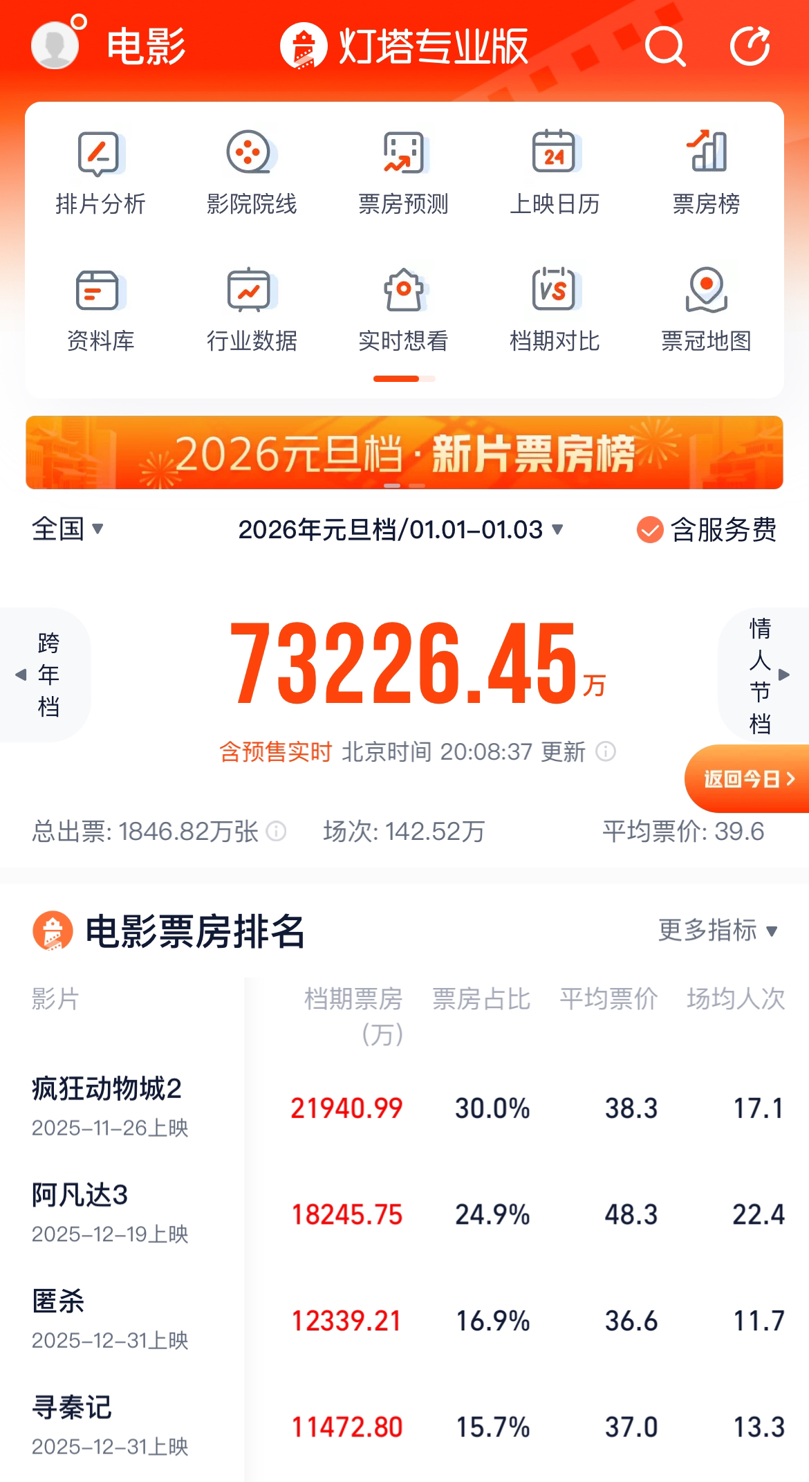 这个元旦档的观影选择有10多部,既有《用武之地》《匿杀》《过家家》等新片,也有仍在热映的《疯狂动物城2》《阿凡达3》等。据灯塔专业版数据,截至1月3日19:45分,2026年元旦档档期(1月1日-1月3日)总票房破7.3亿。元旦档新片中,票房前三名为《匿杀》《寻秦记》《用武之地》,其中《用武之地》口碑分最高。